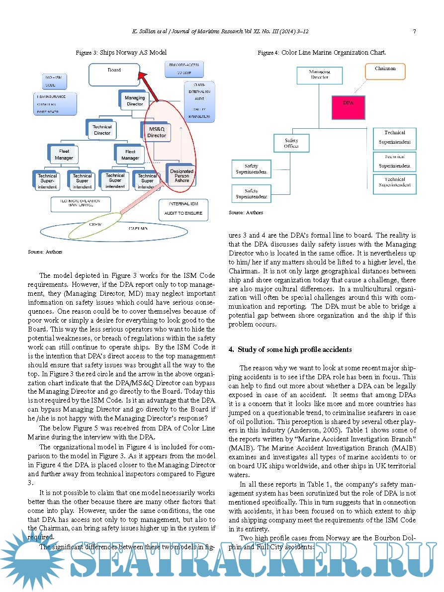 Year: 2014 Language: english Author: JOURNAL OF MARITIME RESEARCH Genre: Practical guide Format: PDF Quality: OCR with errors Pages count: 10 Description: This paper focuses on how the Designated Persons Ashore (DPAs) perceive their role in the shipping organization in relation to the International Safety Management Code (ISM) requirements and to which extent they are legally exposed in case of an accident. The ISM Code expects continuous improvement in safety on board. The DPA is responsible for determining the eectiveness of the safety management system within the company and onboard the ship. This paper seeks to enlighten the DPA’s role in the organization and the interpretation of the responsibility in relation to the ISM Code after an accident. The research questions are: (1) How do the DPAs perceive their position in the Company? ; (2) Can DPAs be legally exposed in case of an accident? ; (3) Can DPAs be charged with negligence?; and (4) Do DPAs need a special insurance? The method used is interviews with four DPAs working for shipping companies and two other experts in this field. In addition to this, e-mail exchange with other professional bodies, discussions with active DPAs and study of relevant literature. The results of the analysis show the absence of recent debate in this field and little attention from the accident reports. Further, one weakness of the ISM Code seems to be that it does not clearly define what is “top management” and therefore does not make clear demands on how high up in the system to DPA should report. This paper shows that to succeed in this role as a DPA he/she is dependent of a good cooperation with other departments in the organization and full support from top management.