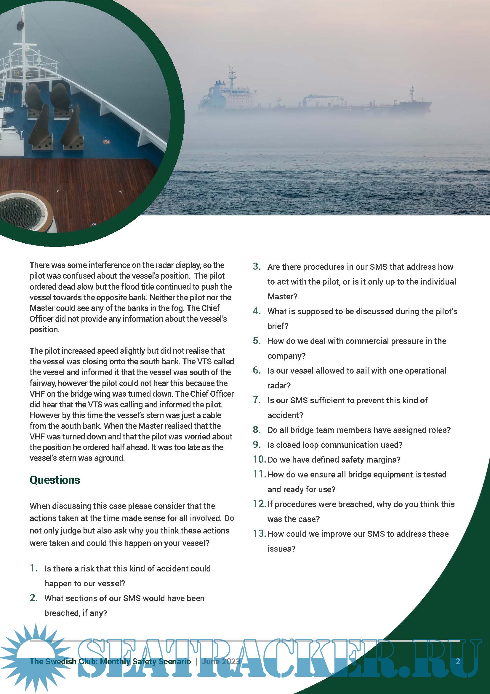 Year: 2023 Language: english Author: the Swedish Club Genre: Periodical (magazine) Format: PDF Quality: eBook Pages count: 3 Description: The Club is publishing, on a monthly basis, a new Monthly Safety Scenario (MSS) to assist owners in their efforts of complying with the above regulations. Alternative scenarios will be uploaded in SCOL. It is easy to download the MSS and enter the written conclusions from the meeting and send feedback to the shore-based organisation. Issue June, 2023 Under the ISM requirement, owners are obliged to carry out monthly safety meetings or safety committee meetings onboard their vessels. This obligation stems from Chapter 5 of the ISM Code: “Master’s responsibility and authority” and furthermore from “5.1.2, motivating the crew in the observation of that policy”.