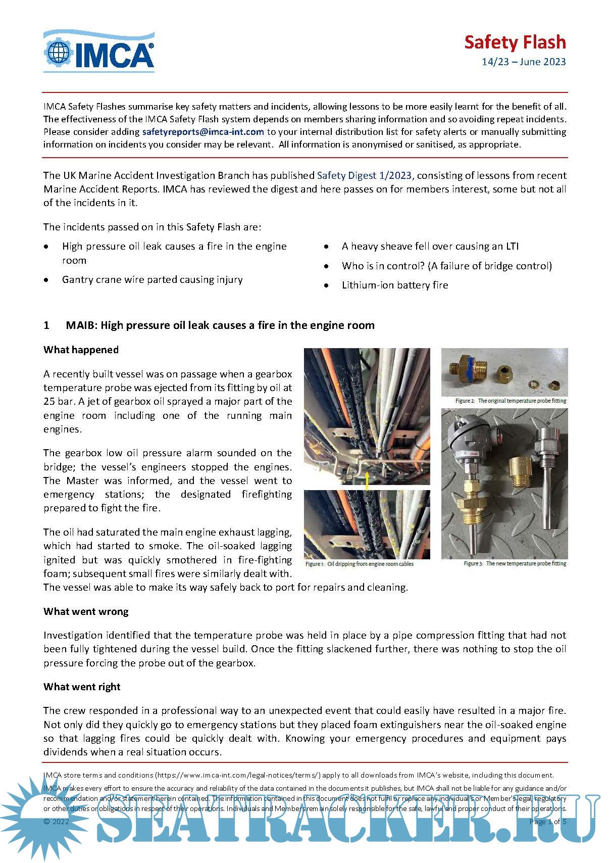IMCA SF 14/23 - MAIB: High pressure oil leak causes a fire in the engine room - MAIB: Gantry crane wire parted causing injury - MAIB: A heavy sheave fell over causing an LTI - MAIB: Who is in control? - MAIB: Lithium-ion battery fire