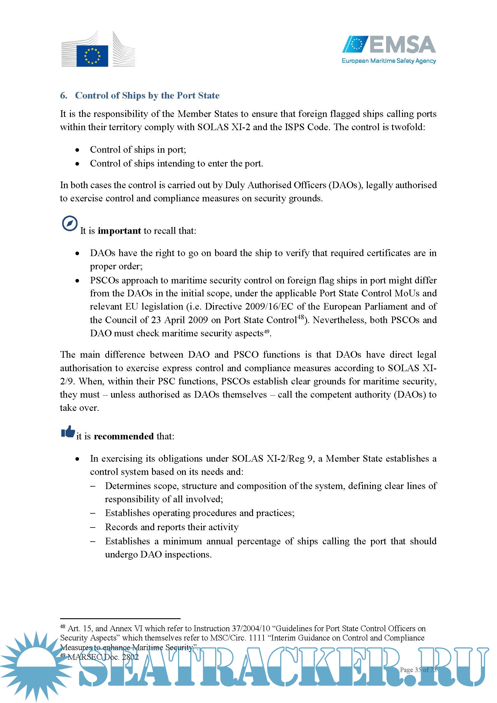 Year: 2022 Language: english Author: EMSA Genre: Guide Format: PDF Quality: eBook Pages count: 73 Description: This document provides guidance to assist Member States in achieving a harmonised and effective implementation of Union law in the field of maritime security, particularly Regulation (EC) No 725/2004 of 31 March 2004 on enhancing ship and port facility security (hereinafter referred to as the Regulation) and Directive 2005/65/EC of 26 October 2005 on enhancing port security (hereinafter referred to as the Directive). In particular, this guidance focuses on administrative and control tasks that need to be executed by Member States’ Competent Authorities for maritime security in relation to the following areas: • Member State obligations; • Role as flag State; • Role of Recognised Security Organisations (RSOs); • Role as port State (i.e. Duly Authorised Officers, DAO); • Port Facilities; • Communication of information.