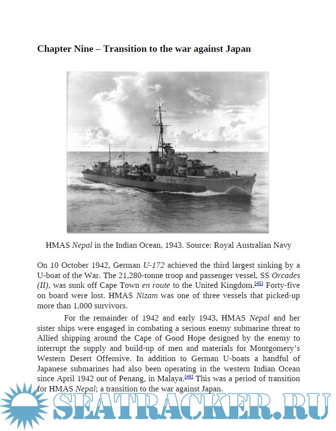 In Part Two of the book, the War took her from the coast of Madagascar, protecting convoys from Japanese submarines, to attacking Japanese positions and installations in Burma, Java and Sumatra, then to the Okinawa Campaign – the largest amphibious assault of the Pacific War – and finally to supporting attacks upon the Japanese mainland. She had the honour of being the first Australian Navy ship to berth in Tokyo Harbour after the surrender ceremony. HMAS Nepal survived all of this without a single loss to the crew.