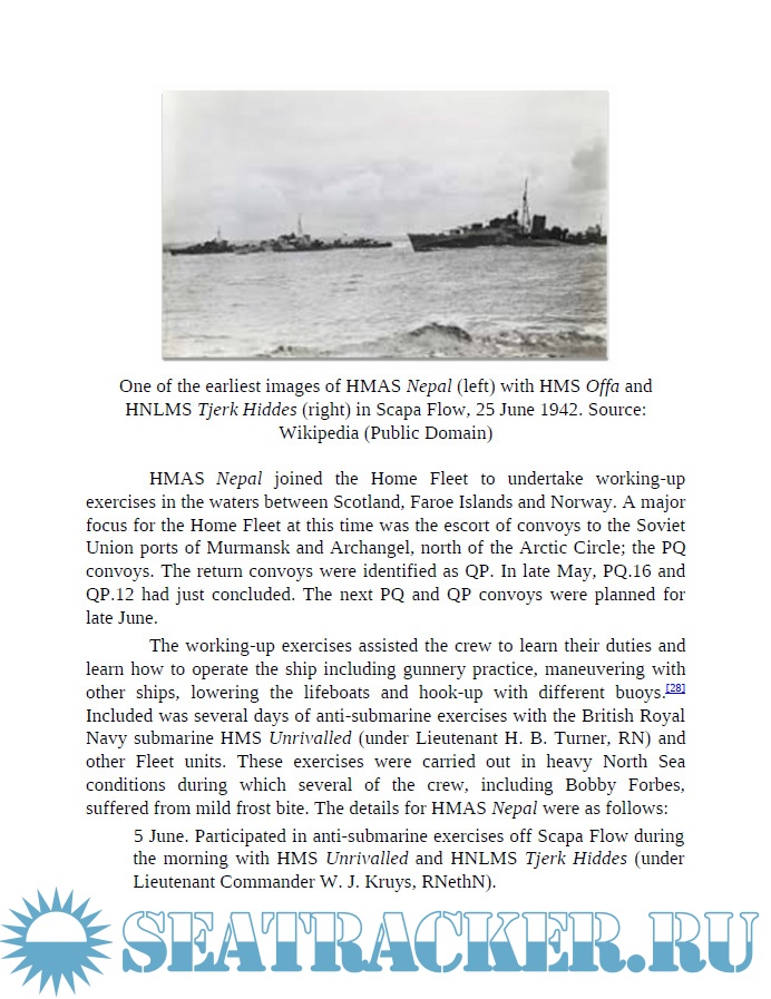 Year: 2019 Language: english Author: Allan A. Murray Genre: History Publisher: The Family Murray Trust Edition: Men and Ships at War Format: PDF Quality: Scanned pages Pages count: 119 Description: The only complete history of Australia's World War II fleet destroyer, HMAS Nepal. This book is a description of the service during World War II of the Australian fleet destroyer, HMAS Nepal, including the period when Allan's great-uncle, Bobby Forbes, was a crew member. The period 1939-43 is the focus of Part One of this book, the time when Bobby Forbes served on HMAS Nepal; a chameleon destroyer, ever changing in form and identity. Laid down in the first week of the War, HMAS Nepal was the last of the N Sub-class destroyers to commission into the Australian Navy. After working up with the Home Fleet she spent time in the north Atlantic Ocean. This book looks at the question of why HMAS Nepal was not awarded the battle honour ‘ATLANTIC 1939-43’. HMAS Nepal transferred to the Indian Ocean, spending most of the War there. The year 1943 is an appropriate interregnum in the story of HMAS Nepal. Firstly, Bobby Forbes left the ship in late 1942. Secondly, HMAS Nepal’s service was more focused upon the war against Japan. Insights are provided on the Disruption phase of the Australian Campaign that commenced after September 1942. In Part Two of the book, the War took her from the coast of Madagascar, protecting convoys from Japanese submarines, to attacking Japanese positions and installations in Burma, Java and Sumatra, then to the Okinawa Campaign – the largest amphibious assault of the Pacific War – and finally to supporting attacks upon the Japanese mainland. She had the honour of being the first Australian Navy ship to berth in Tokyo Harbour after the surrender ceremony. HMAS Nepal survived all of this without a single loss to the crew. Up until early 1943, HMAS Nepal had been a chameleon. During 1943 she established a reputation as a truly Australian fleet destroyer. By 1945 she was respected as one of Australia’s more capable, trusted and best led fleet destroyers of World War II. The Foreword to this book is by Cameron Forbes, a grandson of Bobby Forbes.