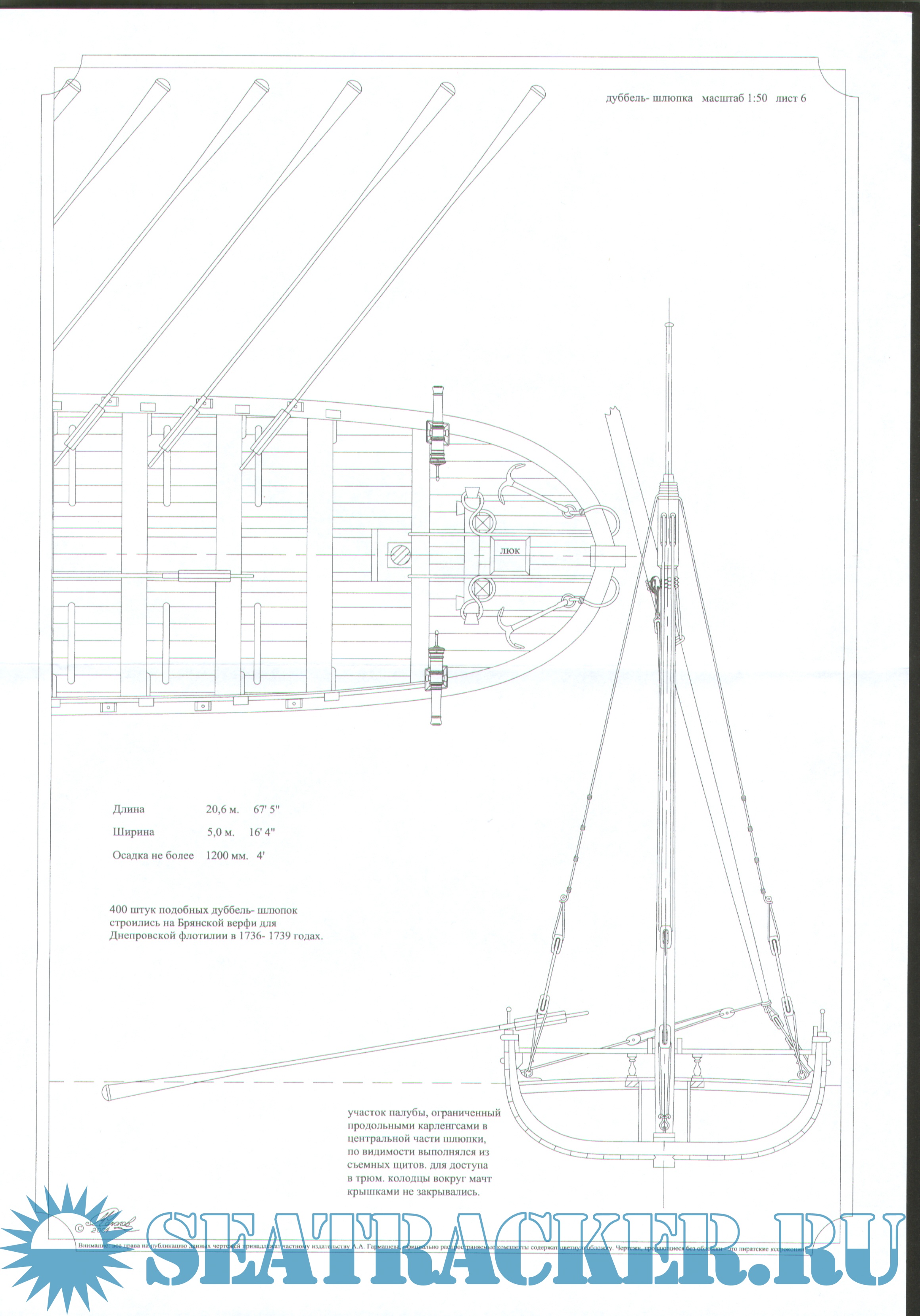 8 листов чертежей дуббель-шлюпки 1736 год в масштабе 1:50