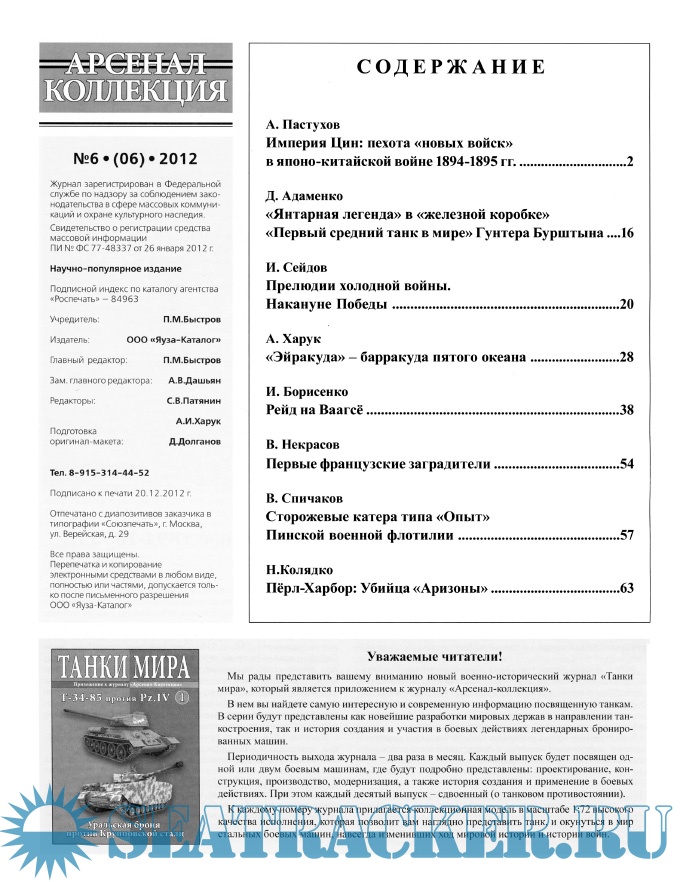 Описание: «Арсенал-Коллекция» - ежемесячный научно-популярный, военно-исторический журнал. Журнал о военной технике - кораблях, авиации, танках, а также о великих сражениях и военных операциях. История изобретения, описание самых удачных операций, побед и поражений – вот что ждет читателей на страницах издания. Красочные обзоры, схемы, фотографии точно не оставят вас равнодушными. Объем ~ 68 страницы, разбитые примерно поровну на три блока - сухопутный, авиационный и морской.