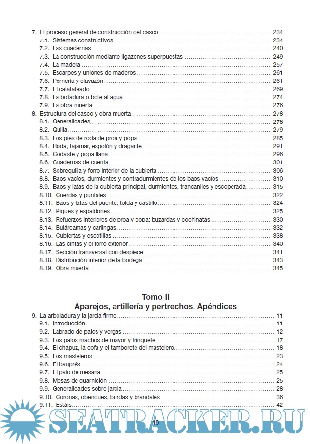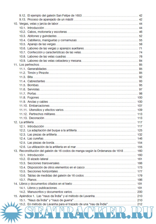 Les fonts d’informació, la Cursa d’Índies, les Armades Reials, les unitats de mesura utilitzades en l’àmbit naval, la problemàtica dels arqueigs, les ordenances de construcció, el disseny de vaixells i la seva evolució, les drassanes, els materials, la anatomia del casc, l’arbradura, els aparells, les espelmes, els proveïments i l’artilleria formen un complet programa de temes que són tractats amb cura.