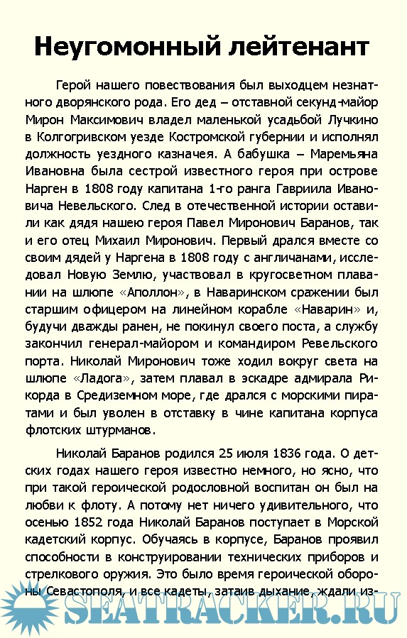 Описание: Героем книги известного писателя-мариниста капитана 1 ранга Владимира Шигина является одна из интереснейших личностей в истории российского флота – капитан-лейтенант Баранов. Талантливый историк, изобретатель и конструктор стрелкового оружия, он, командуя вооруженным пароходом «Веста», выходит победителем из неравного боя с турецким броненосцем. Именно Баранову поручает император Александр Третий наведение порядка в столице, после убийства его отца Александра Второго. Большую известность получил Баранов и как генерал-губернатор Нижнего Новгорода, став одним из лучших руководителей этого региона за всю историю. Именно Баранов является «отцом» знаменитой Нижегородской ярмарки, а о его оригинальности до сегодняшнего дня ходят анекдоты.