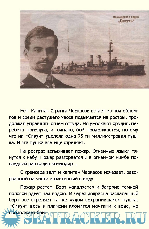 Описание: В многочисленной плеяде героев нашего флота капитан 2 ранга Петр Черкасов занимает особое место. Подвиг его был высок и жертвенен, но ныне, к сожалению, почти забыт. Начавшаяся вскоре череда революций и братоубийственная Гражданская война привнесли иных «героев» нового времени. И все же и сегодня, спустя столетие подвиг, совершенный Петром Ниловичем Черкасовым не может не вызывать восхищения и преклонения перед его памятью.