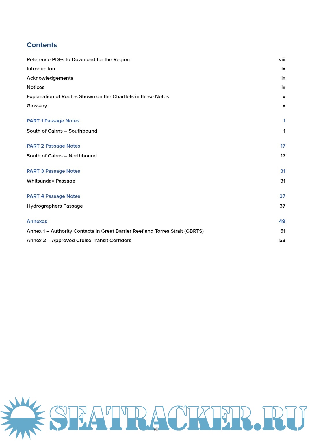 Year: 2023 Language: english Author: Witherby Publishing Genre: Guide Publisher: Witherby Publishing Group Ltd. Format: PDF Quality: eBook Pages count: 68 Description: This free publication is a companion guide to the main passage guide for this region: ‘Passage Planning Guide – Great Barrier Reef and Torres Strait’. It contains waypoints, tabulated passage info and charts for these routes. ‘Passage Planning Guide – Great Barrier Reef and Torres Strait’ contains in-depth descriptive narrative and pilot’s guidance for ships navigating through the Torres Strait, the Great North East Channel or the Inner Route to Cairns, using the routes defined in the AMSA QCPP. Additional info:https://seatracker.xyz/viewtop...hp?p=76168#76168