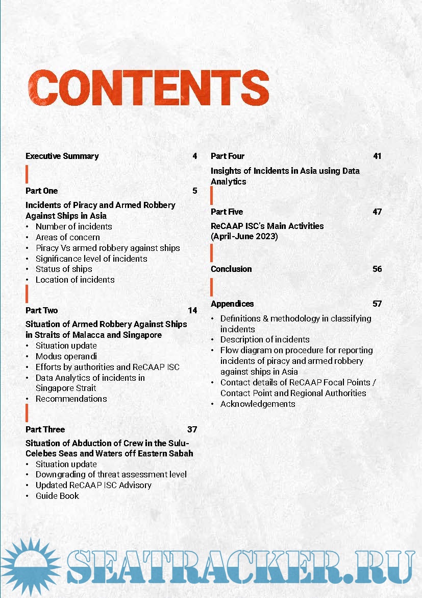 Year: 2023 Language: english Author: ReCAAP Genre: Research papers Format: PDF Quality: eBook Pages count: 94 Description: The Asian region for the third consecutive year, received no report of piracy incident on the high seas. However, the incidents reported are invariably Armed Robbery Against Ships (ARAS), which were of opportunistic and less severe in nature during the first half-year of 2023. The Centre through these forums/meetings urges the maritime authorities and law enforcement agencies to continue to collaborate, communicate, coordinate and cooperate in information sharing amongst the littoral States, and step up the enforcement measures both on land and at sea in our endeavour to suppress the occurrence of piracy and ARAS in Asia. report for period of January - June 2023