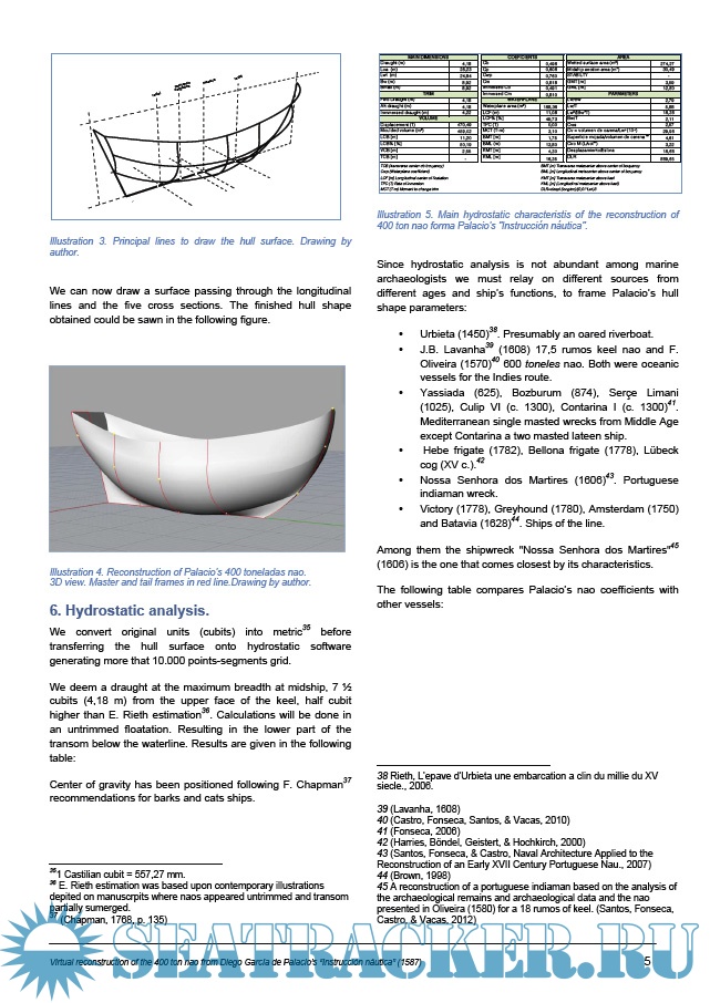 Year: 2023 Language: english Author: Ricardo Visiers Genre: History Format: PDF Quality: eBook Pages count: 8 Description: The period between 1570-1620 has left a remarkable amount of documents related to shipbuilding in the Iberian Peninsula. Among them, the Instrucción náutica written by Diego García de Palacio in 1587 is widely recognized as the first published book that includes an extensive discussion of ship design and construction. García de Palacio centres his discussion on a 400 toneladas nao, a series of woodcuts that illustrate the shape and dimensions of the ship accompany the explanation. In the late XVI century ship hulls were designed following procedures based upon an old shipwrightry tradition born in the Mediterranean. By simple rules the master shipwright plots the central frame and tail frames and complete the hull body using wooden ribbands. Computer software for 3D modelling using NURBs surfaces helps to recreate ships hulls. In this work the 400 toneladas nao is reconstructed and her hydrostatic parameters are compared with other ships.