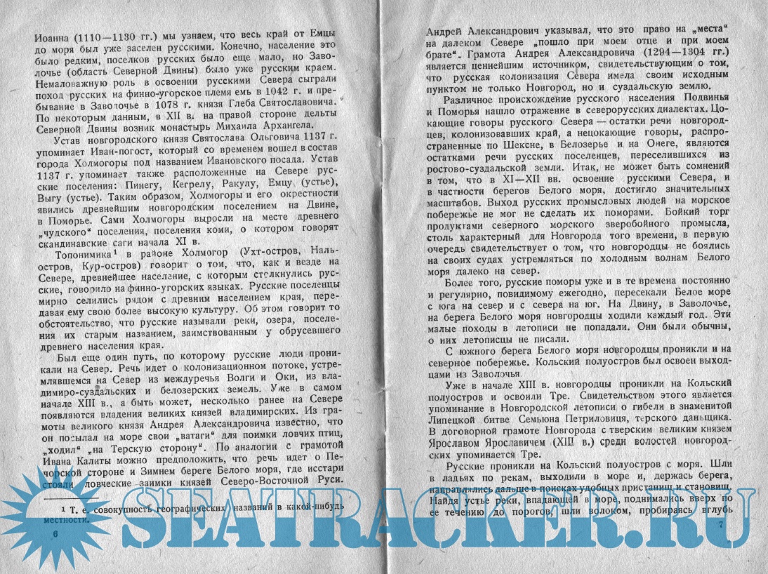 Год выпуска: 1955 Язык: русский Автор: В.В. Мавродин Жанр: История Издательство: Всероссийское общество по распространению полит и научных знаний Формат: PDF Качество: Отсканированные страницы Количество страниц: 36 Описание: Удивительное издание Советского историка, специалиста по истории древнерусской государственности и этнической истории русского народа В.В. Мавродина доктора исторических наук, профессор исторического факультета ЛГУ. В брошюре захватывающе интересно, с историческими фактами описывается освоение Севера русскими поморами и казаками с древних времён до 16 века. Север становился ареной борьбы между Россией и враждебными ей государствами. Во время русско-шведской войны Иван III предпринял поход на Крайний Север Европы. В конце XVI в. русские уже ходили уже морем из Северной Двины на Енисей, а возможно, и далее; у них сложилось убеждение, что "теплое море" продолжается далеко на восток.
