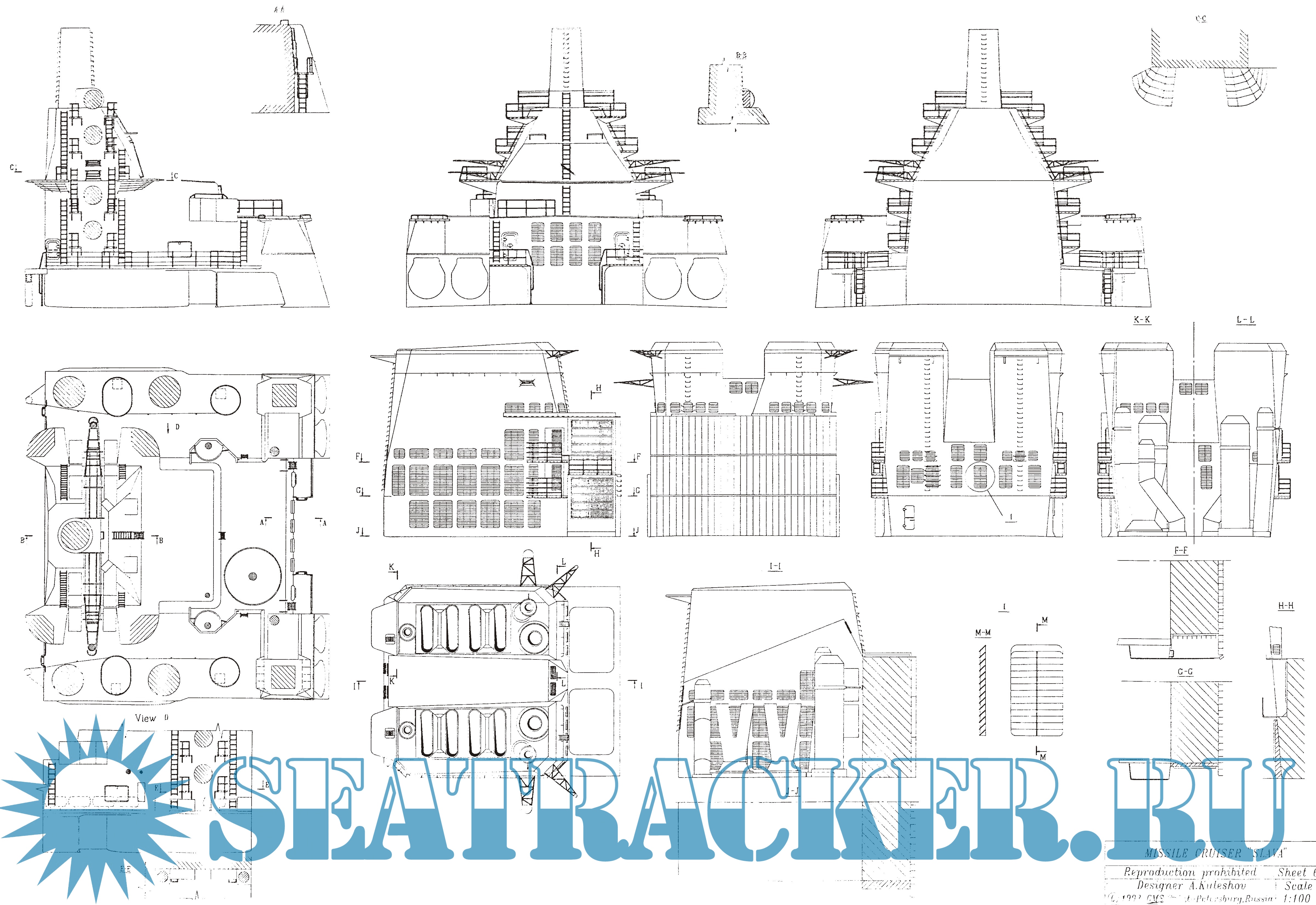 Описание: 7 листов чертежей ракетного крейсера "СЛАВА" (проект 1164) в масштабе 1:100