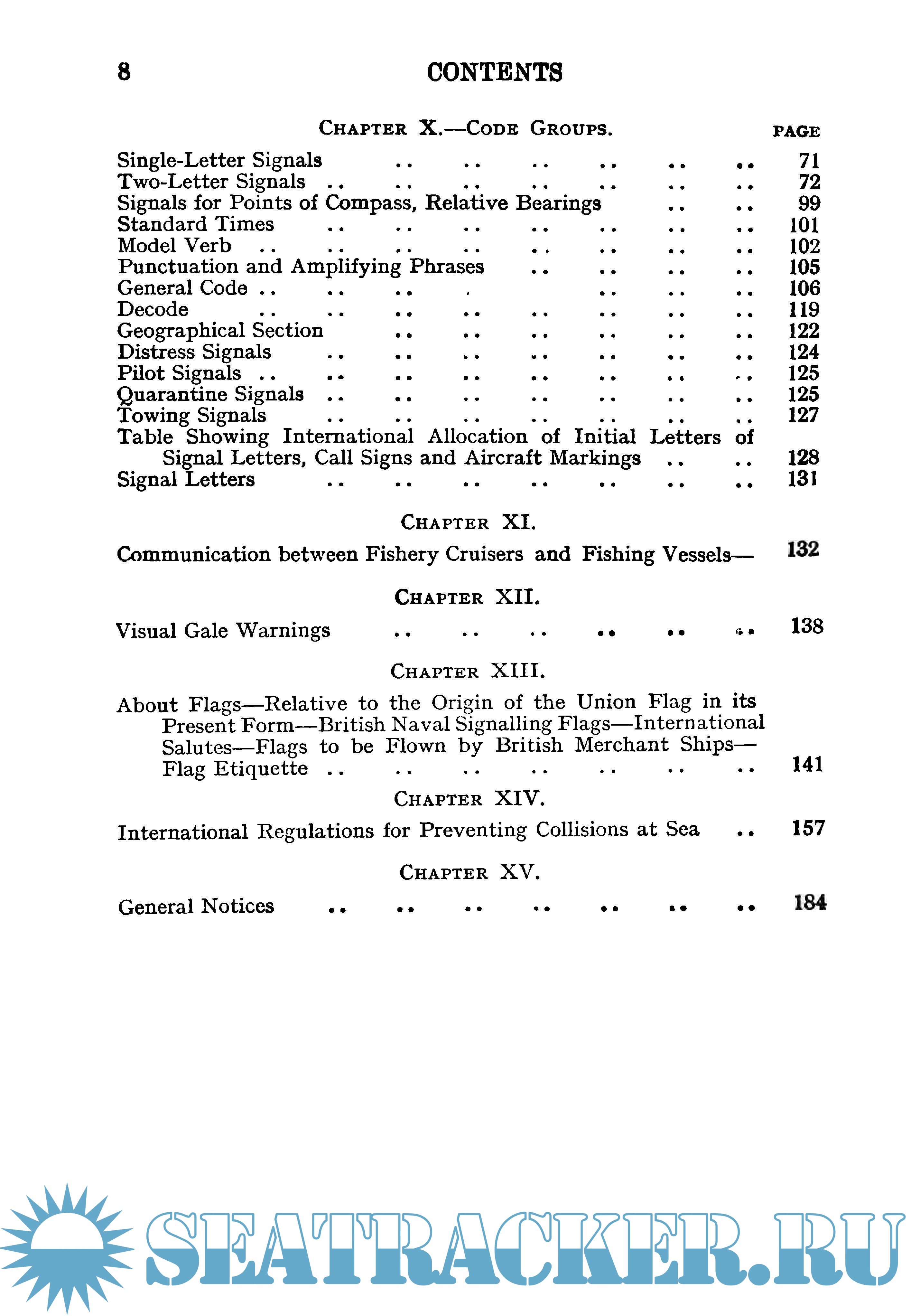The arrangement of the groups is the same as in Vol. 1 of the Code. A distinctive feature, and one which will be greatly appreciated, is the insertion of sufficient Code groups to admit of practice in the coding and decoding of messages. Numerous questions, with answers, relating to all forms of signals incorporated in the code, are given, along with coloured plates showing a complete set of signalling flags and the principal types of hoists.