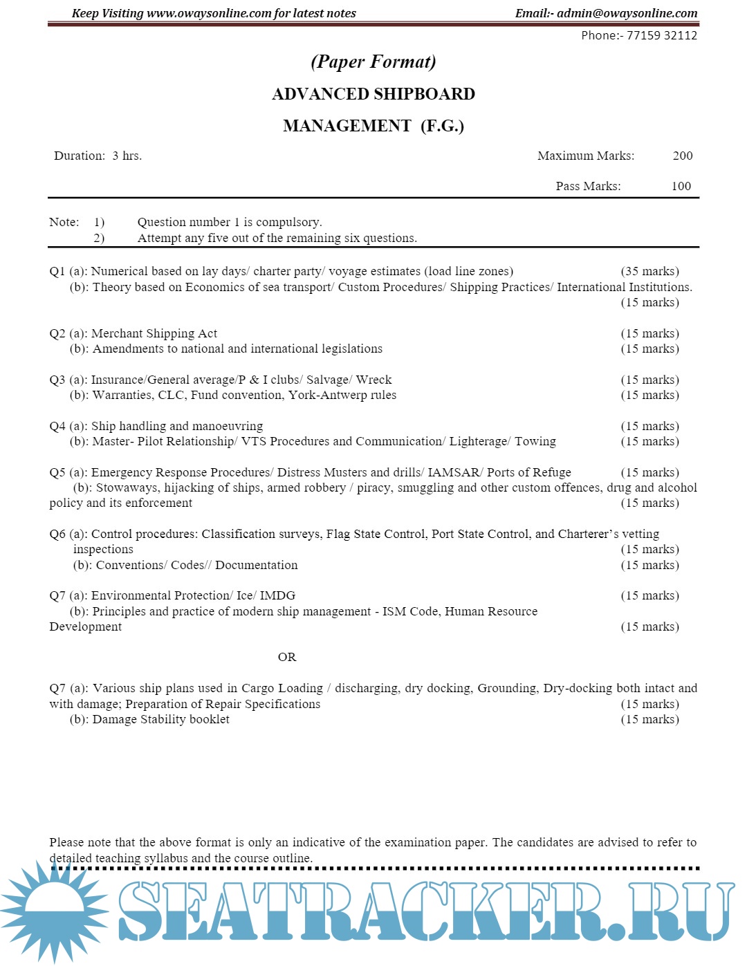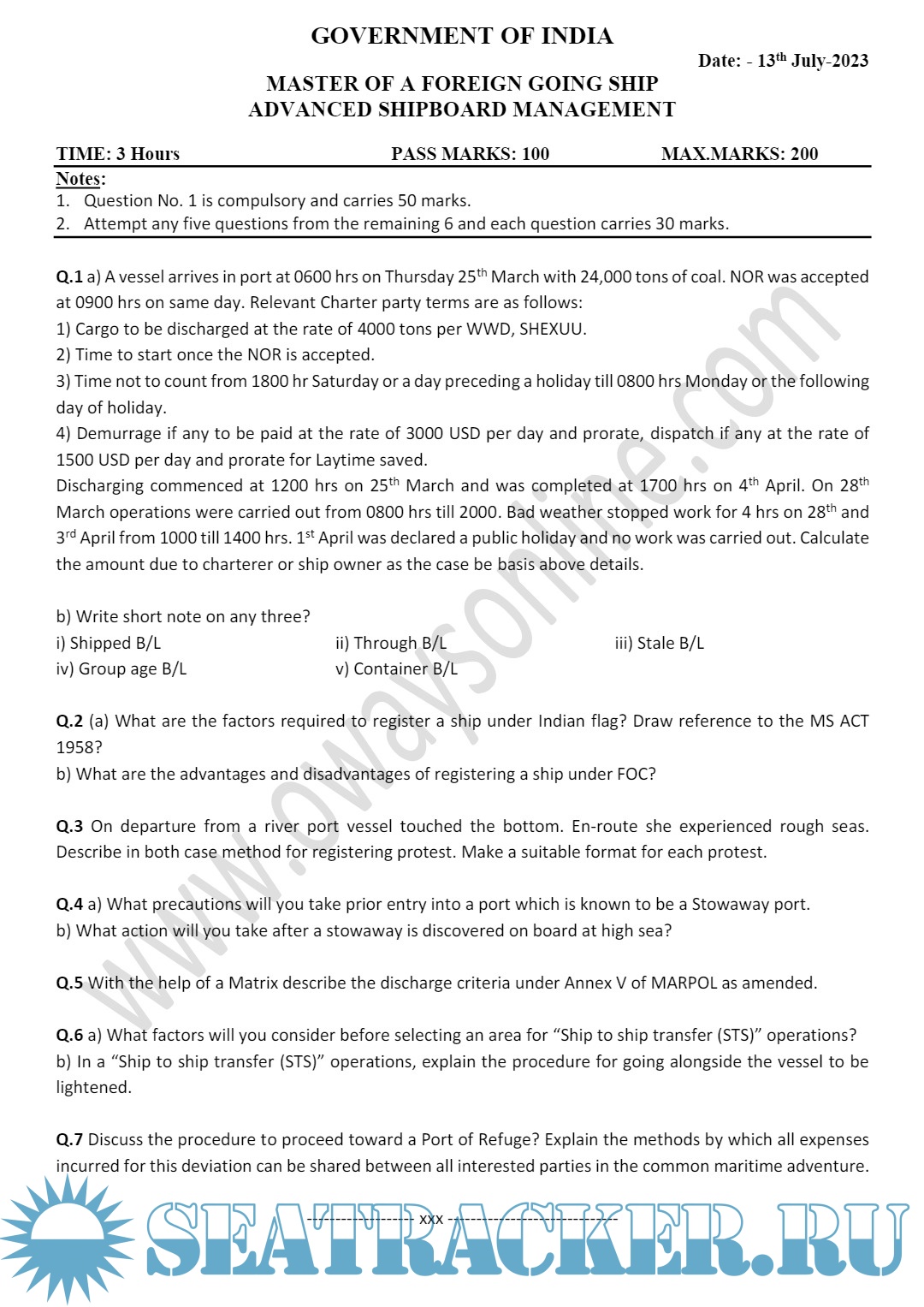 Question Paper Set for (ASM) Advanced Shipboard Management (July 2023) for Master's Examinations, Mercantile Marine Department (MMD), India