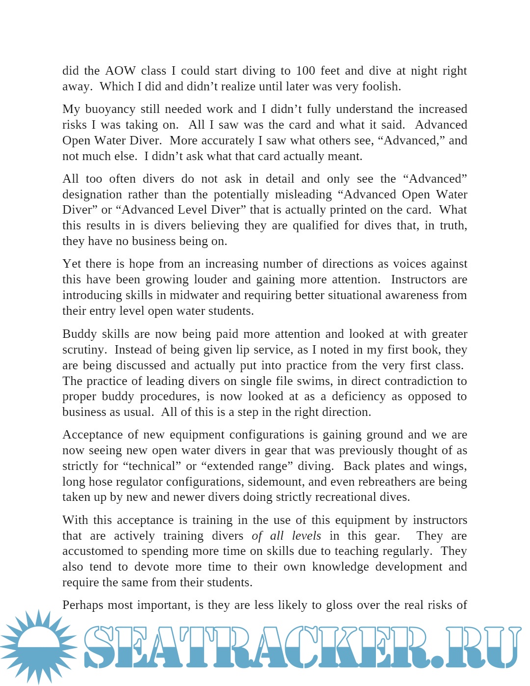 Year: 2016 Language: english Author: James Lapenta Genre: Guide Edition: Kindle | 1st Format: PDF Quality: eBook Pages count: 330 Description: Building on his first book, "SCUBA: A Practical Guide for the New Diver", James Lapenta addresses what is most often the next step in diver training. Advanced Level or Advanced Open Water training is often taken by divers to gain additional skills and knowledge. It is also taken to allow them to gain access to more challenging dives and dive sites. These also pose a greater degree of risk to the individual. Unfortunately some advanced classes are no more than a "taste" or "tour" of advanced level dives. The divers do not get the new knowledge and skills required to safely embark on these dives. In order to safely pursue these dives James has outlined the steps to take to reduce the risk of injury and worse. From describing the dives to offering advice on the content one should expect, as well as selecting an instructor, he offers new and not so new divers guidance. Additional sections on equipment options, air supply management, dive planning, and dive selection for maximum learning potential are looked at. Also included is a section on a subject often overlooked in recreational SCUBA diving - the after-effects of a diving accident and rescue/recovery on the rescuer and witnesses to the event. Post Traumatic Stress in Recreational Dive Rescues is a real possibility and one that must be looked at when executing dives with greater risk. Safety in training and after training is the heart of this work and the driving force behind its publication. James has experienced the best in training and that which left something to be desired. He gives examples of both throughout the work. If you do not have his first book, it is highly recommended that you also acquire it as a companion to this one. While they do contain some sections of the same information, there are sections in the first book that are not included in this that are highly beneficial. Additional info: