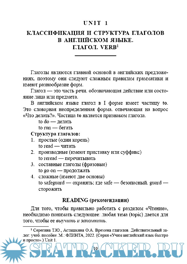 Год выпуска: 2023 Язык: Русский, Английский Автор: Т. Ю. Серегина, О. А. Асташкина Жанр: Учебное пособие Издательство: Флинта Формат: PDF Качество: Изначально компьютерное (eBook) Количество страниц: 156 Описание: Книга «Времена глаголов. Действительный залог» состоит из 32 параграфов, каждый из которых представляет определенный раздел грамматики. В этом учебном пособии вы познакомитесь с временами глаголов, действительным залогом (Active Voice). В пособии представлены параграфы для поэтапного изучения неправильных глаголов; статичные глаголы (глаголы состояния); объясняется, как сказать о будущем по степени вероятности совершения действия; вопросительные местоимения; конструкции «have been to», «have gone to»; «have been in»; таблицы, объясняющие различия применения многих одинаково звучащих на русском языке слов и многое другое. В уроках доступно объясняются грамматические правила с использованием таблиц. В каждом разделе даны упражнения с заданиями и примерами по их выполнению.