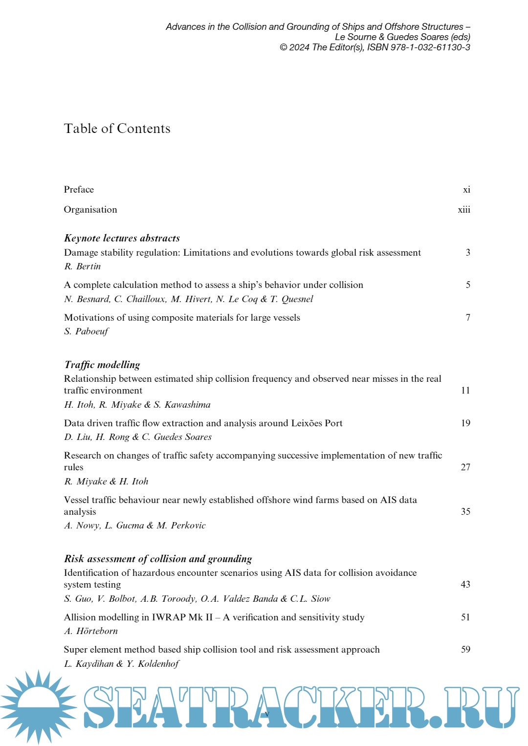 Year: 2023 Language: english Author: Herve Le Sourne, C. Guedes Soares Genre: Textbook Publisher: CRC Press/Balkema Edition: 1 ISBN: 978-1-032-61130-3 Format: PDF Quality: eBook Pages count: 517 Description: This book presents the proceedings of the 9th International Conference on Collision and Grounding of Ships and Offshore Structures held in Nantes, France between 11 and 13 September 2023, under the theme “Advances in the Collision and Grounding of Ships and Offshore Structures”. It occurs in 2023 instead of 2022, which would be the normal periodicity because COVID has created difficult conditions to keep the established periodicity. The history of this series of conferences on Collision and Grounding of Ships and Offshore Structures started a little more than twenty years ago, and previous conferences have been held in San Francisco, USA in 1996, in Copenhagen, Denmark in 2001, in Tokyo, Japan in 2004, in Hamburg, Germany in 2007, in Helsinki, Finland in 2010, in Trondheim, Norway in 2013, in Ulsan, South Korea in 2016 and Lisbon, Portugal in 2019. Participants are drawn from the industrial and academic sectors and are typically naval architects, marine engineers, and scientists from all over the world, who at ICCGS find a forum that provides an ideal setting to share experiences and be informed of the state-of-the-art developments in this area of expertise, providing the atmosphere for many fruitful discussions. For the first time in its history, the ICCGS Conference is organized in Nantes, France, where Institut Catholique d’Arts et Métiers (Icam, School of Engineering) has taken responsibility for the logistics and organization of the Conference, in collaboration with the Centre for Marine Technology and Ocean Engineering (CENTEC), Instituto Superior Técnico (IST), University of Lisbon.