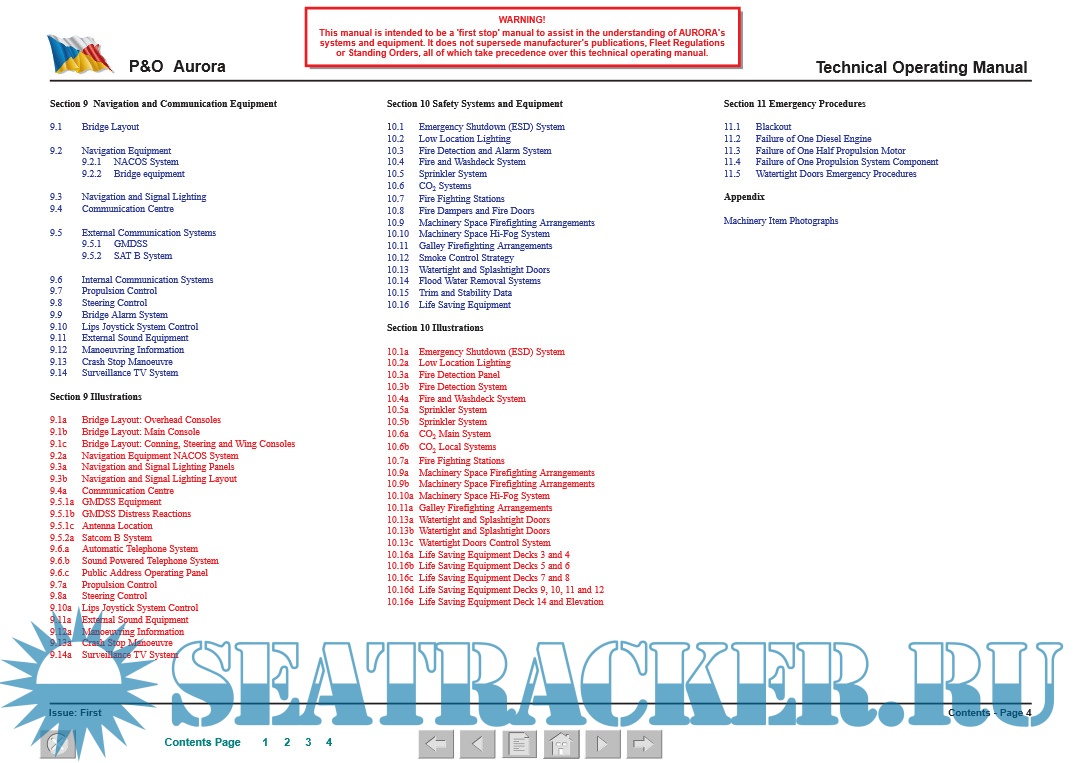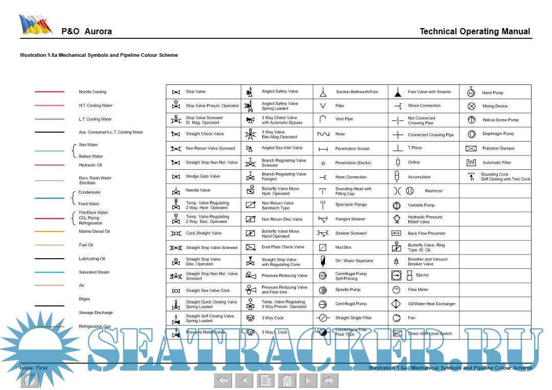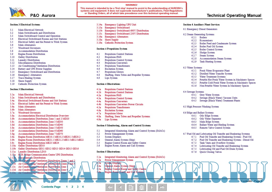 Year: 2001 Language: english Author: WMT Genre: Manual Publisher: P&O Cruises Format: PDF Quality: eBook Pages count: 574 Description: Technical Operating Manual Ship name: AURORA Type: Passenger (Cruise) Ship IMO: 9169524 Company: P&O Cruises The concept of this Operating Manual is to provide information to technically competent ship’s officers who are unfamiliar to the vessel, in a form that is readily comprehensible, thus aiding their understanding and knowledge of the specific vessel. Special attention is drawn to emergency procedures and fire fighting systems. The manual also details the ship’s systems, providing a technical description, system capacities and ratings, control and alarm settings (where practicable) and operating details.