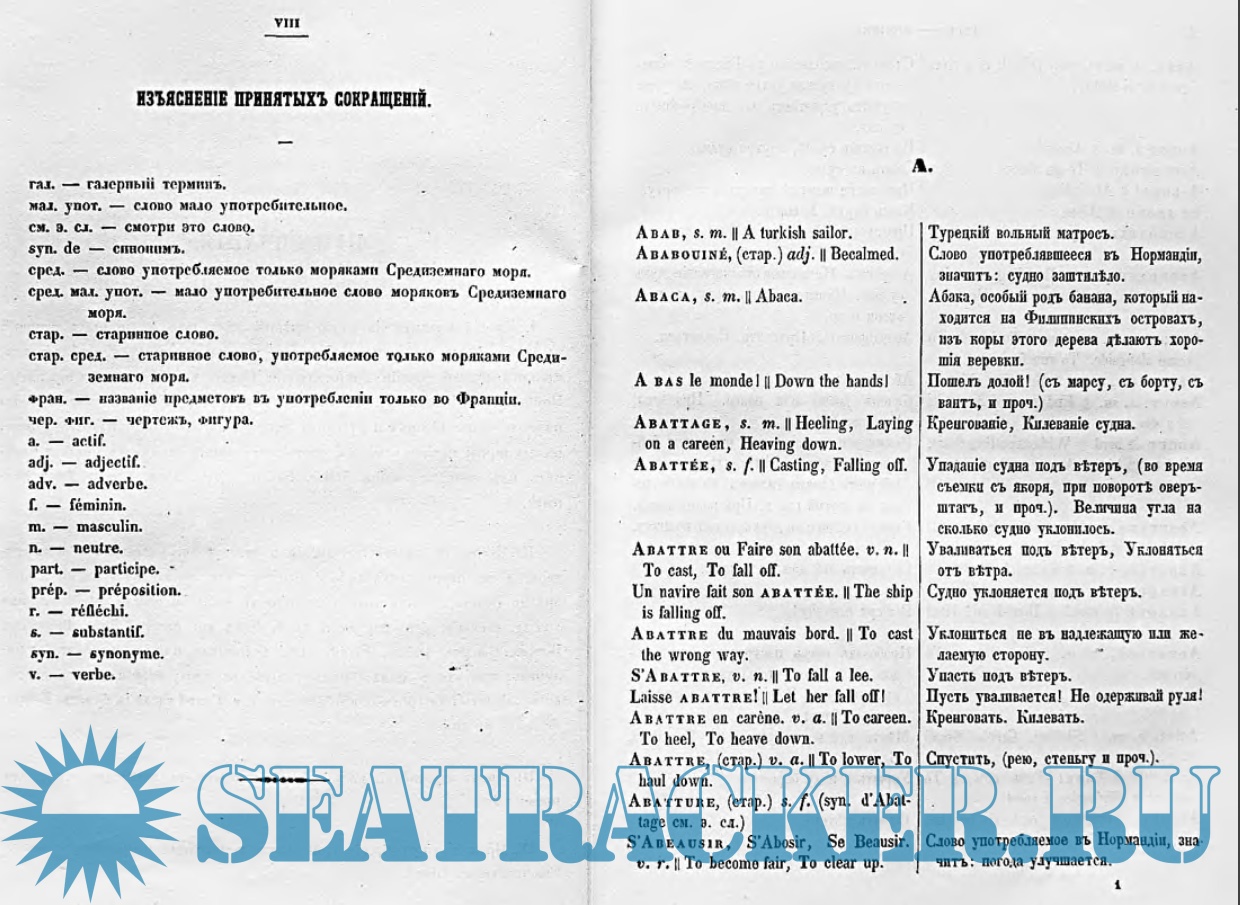 В науке мореплавания явился совершенно новый язык: пароходный, много новых изобретений и следовательно много новых требований. Недостаток в полном парусном и пароходном русском словаре побудили меня взяться за это дело и я составил словарь морских слов и речений, парусного и пароходного флотов. — (От автора). (В словаре приведены и английские термины)