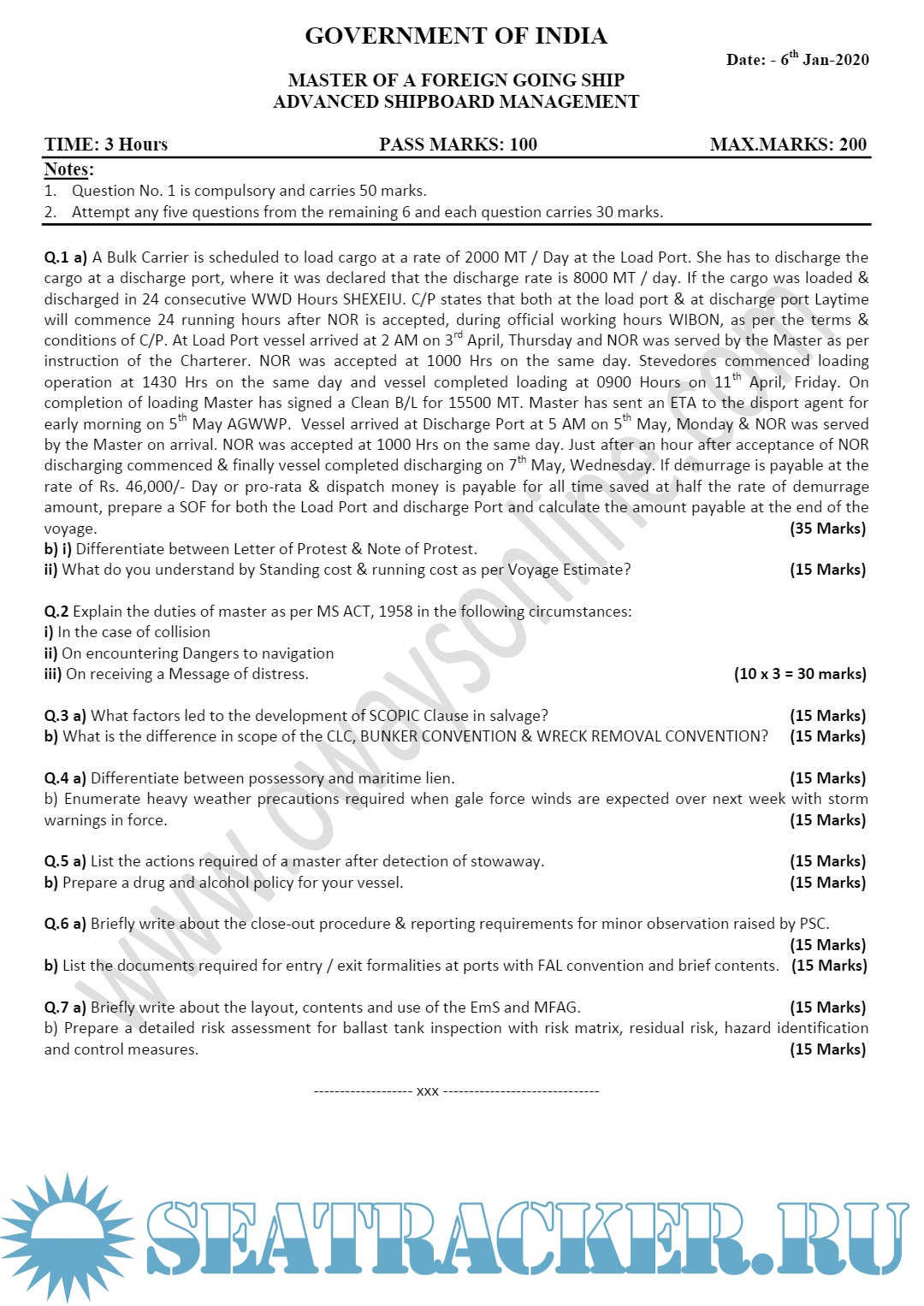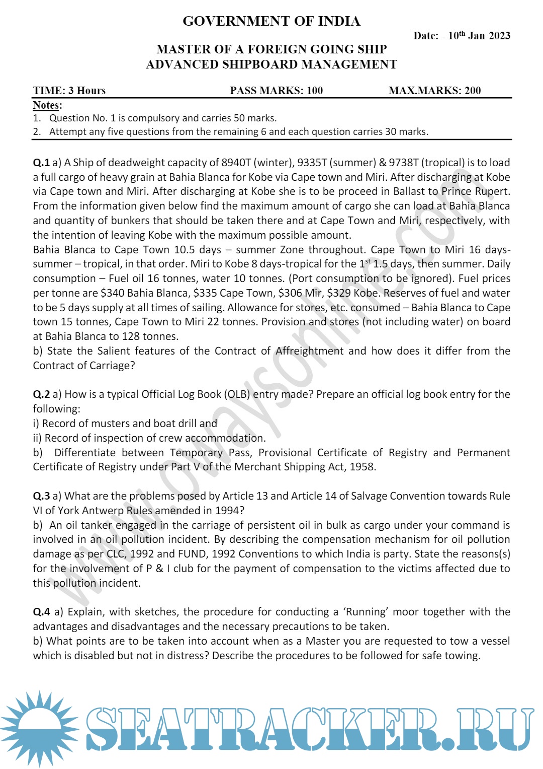 Question Paper Set for (ASM) Advanced Shipboard Management Writtens (September 2023) for Master's Examinations, Mercantile Marine Department (MMD), India