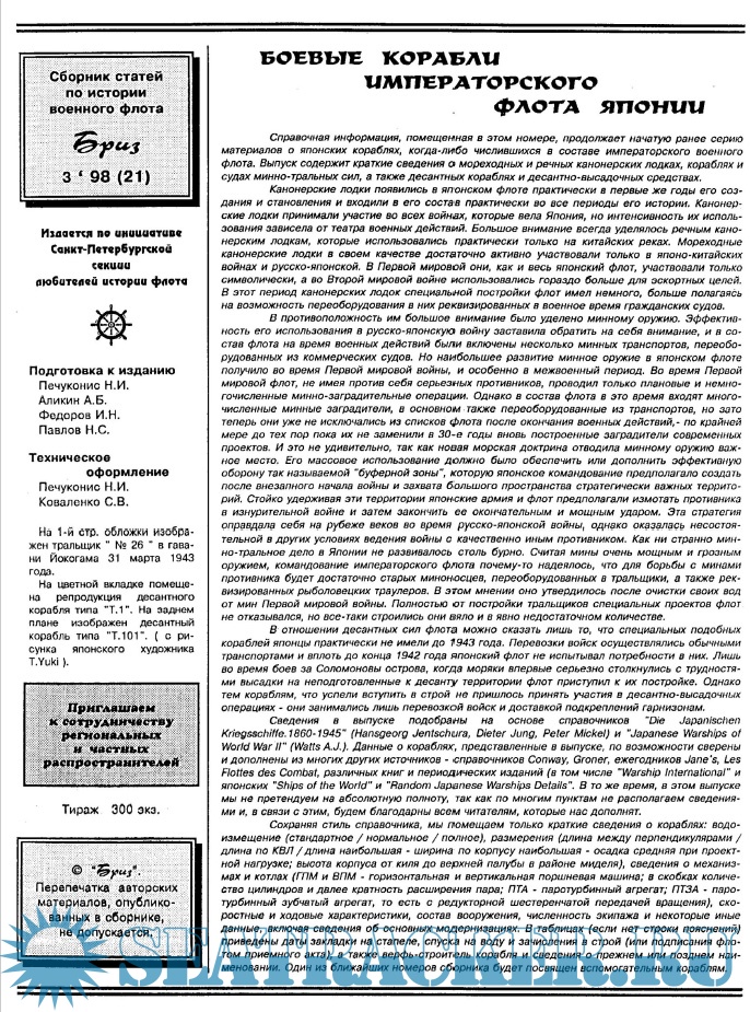 Год выпуска: 1998 Язык: русский Автор: Печуконис Н.И., Аликин А.Б.(редакторы) Жанр: Периодическое издание (журнал) Издание: 1998-03 Формат: PDF Качество: Отсканированные страницы Количество страниц: 45 Описание: Сборник статей по истории флота