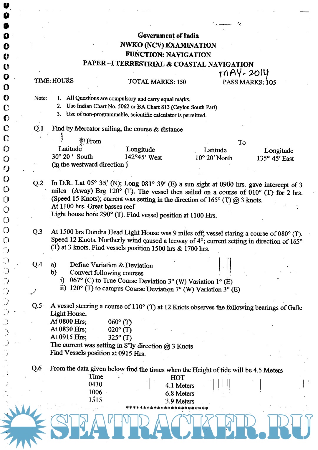 Description: Question paper sets for Officer In Charge of a Navigational Watch (Near Coastal Voyages) | (NWKO NCV)Mercantile Marine Department (MMD), India Examinations.