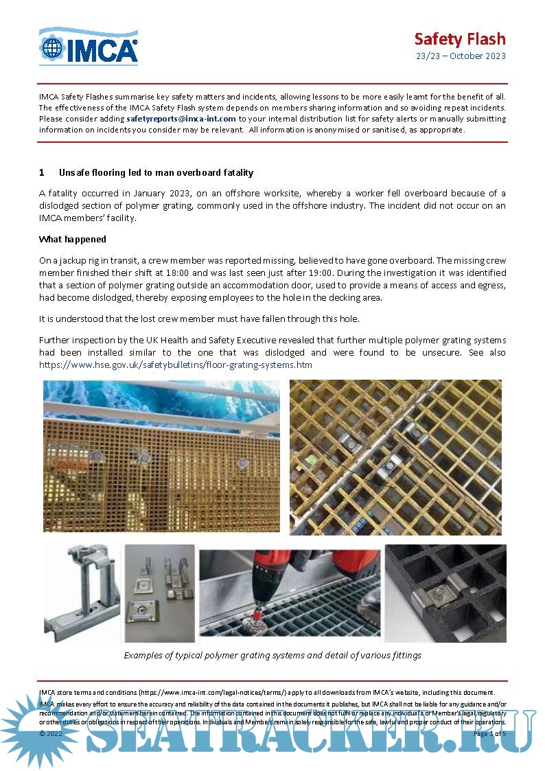 Description: The International Marine Contractors Association ( IMCA ) Safety Flashes disseminate important information on incidents and potential hazards and the lessons learnt from them that can help prevent incidents occurring elsewhere in the industry.IMCA Safety Flashes and systems for incident reporting and analysis are an important tool for sharing vital information.By publishing them, IMCA helps its members around the world identify potential hazards, share lessons learned and avoid repetition.Safety Flashes should be succinct, specific, factually correct and written in clear language.The Secretariat will assist with this through formatting and checking of the material submitted.