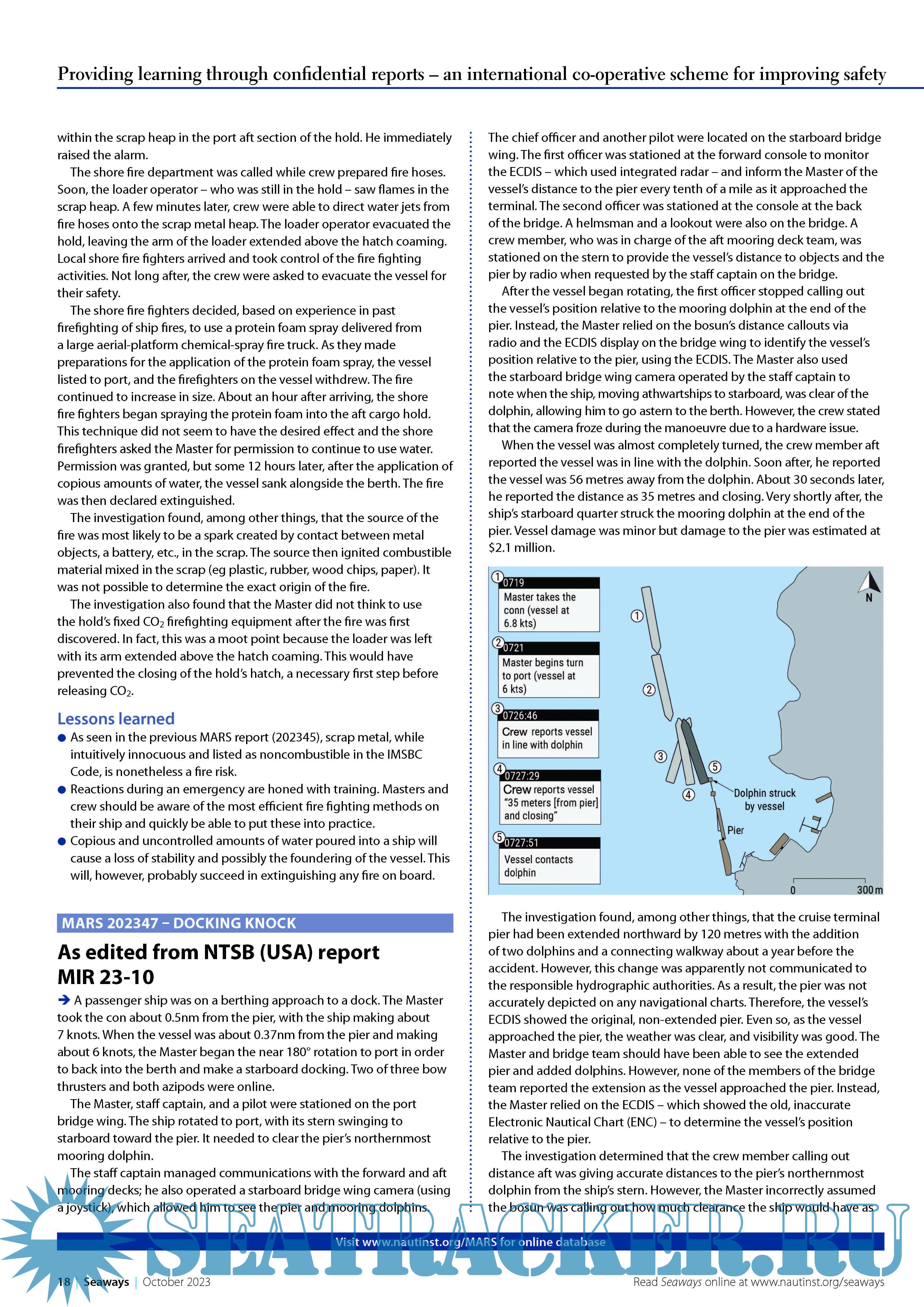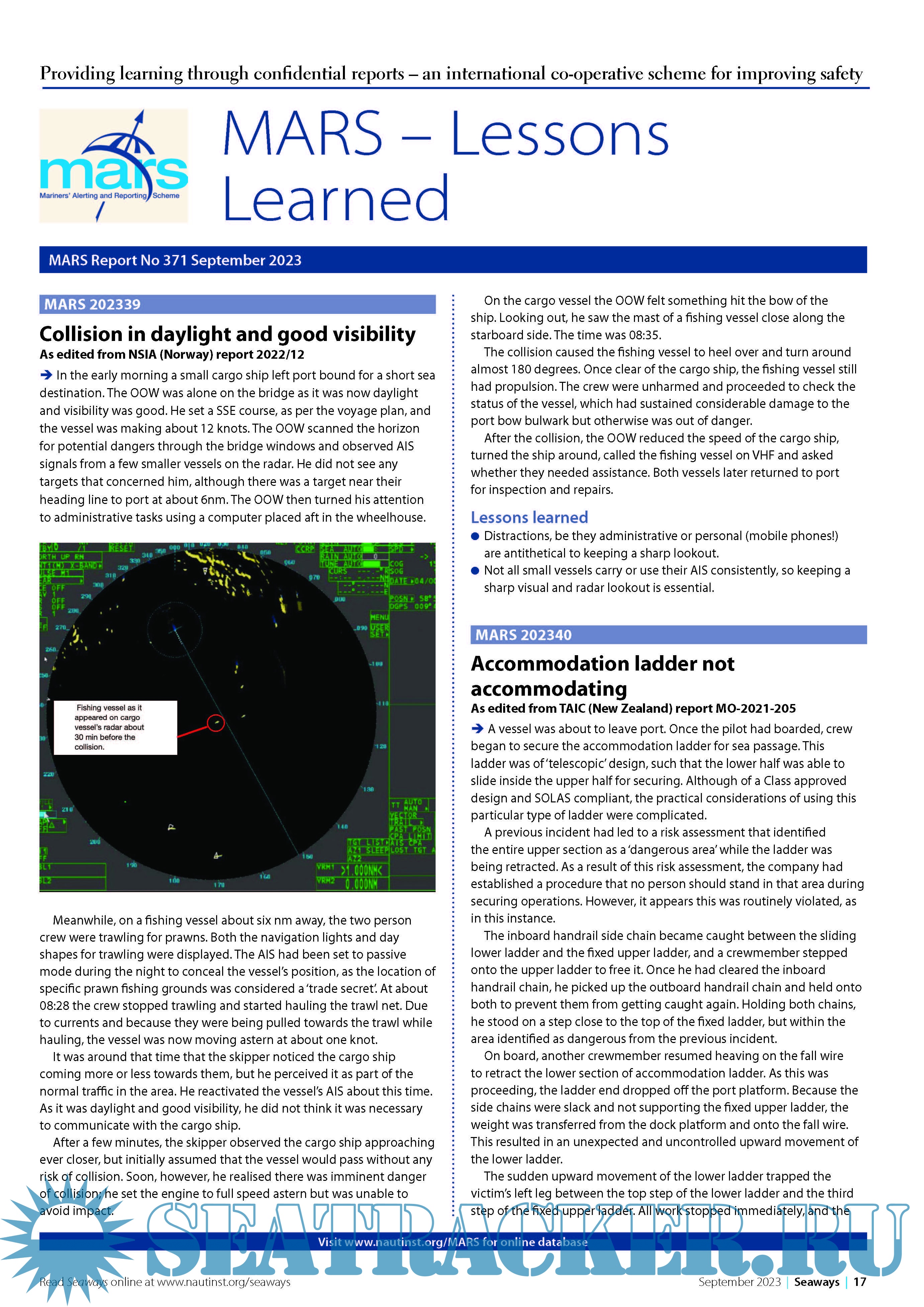 Year: 2023 Language: english Author: The Nautical Institute Genre: Periodical (magazine) Format: PDF Quality: eBook Pages count: 8 Description: MARS Reports No.371 September and No.372 October, 2023 Providing learning through confidential reports – an international co-operative scheme for improving safety.MARS is a searchable database containing reports of accidents and near misses stretching back over a quarter of a century. Funded through the generous support of the Institute's Nautical Affiliate partners, it is one of the maritime industry's leading risk reduction initiatives and is helping to make life safer for seafarers everywhere