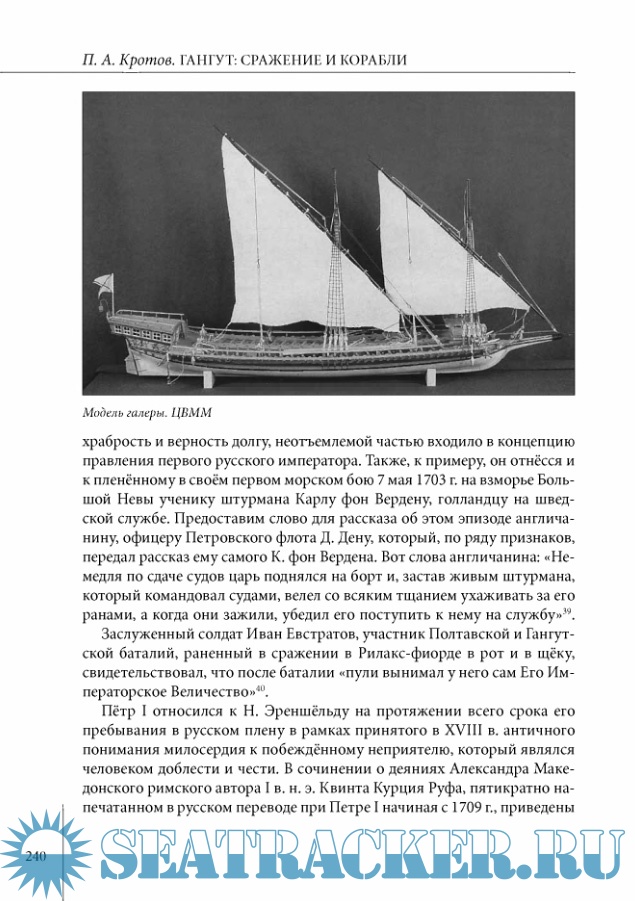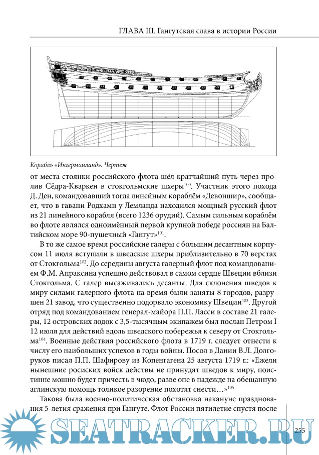 ОГЛАВЛЕНИЕ Введение Концепция правления Петра Великого (5). Рождение России как военно-морской державы (15). Становление Петра I как моряка и флотоводца к 1714 г.: начальный этап, бой 7 мая 1703 г., командование кораблями и эскадрами (27). Глава I Подготовка морской кампании 1714 года и поход русского корабельного и галерного флотов Замысел Петра I завершить войну со Швецией в 1714 г. (62). Подготовка корабельного и галерного флотов к кампании. Типы судов русского галерного флота: полугалеры и скампавеи (74). Объявление Санкт-Петербурга «царствующим градом» 8(19) мая 1714 г. перед выходом флота в море. Настроение россиян на победу (89). Поход корабельного флота к Ревелю, галерного к полуострову Гангут. Пётр I и генерал-адмирал Ф.М. Апраксин во главе Российского флота (93). Новый план кампании (106). Руководство Петра I действиями русских галер у полуострова Гангут. Переволока и знак Петра I на камне: загадки поиска (111). Прорывы русских галер у Гангута 26-27 июля 1714 г. (121). Глава II. Сражение при Гангуте Русские и шведы готовятся к сражению: состав шведского шхерного отряда Н. Эреншёльда, место баталии, артиллерийское вооружение кораблей, численность противников, распределение сил россиянами (139). «Благородный вымысел» в описании баталии Н. Эреншёльда (167). Сражение при Гангуте в изложении Й.А. Нурдберга (1740): литературные героико-эпические мотивы (170). Переговоры со шведами о сдаче без боя (173). Начало сражения: артиллерия вступает в дело (174). Отразили ли шведы две атаки россиян? (181) Проход русских галер в тыл шведам (182). Тактика русского галерного флота в баталии (185). Флотоводческое искусство Петра I (186). Потери сторон (188). Участники баталии (193). Награды (201). Последствия сражения при Гангуте в кампанию 1714 г. (206). Значение сражения при Гангуте в Великой Северной войне (211) флота (251). Корабли Российского флота, названные в честь победы, — традиции продолжаются (266). Памятники во славу морской виктории (273). Приложения № 1. 1714 г., после 27 июля. — Донесение шаутбенахта Нильса Эреншёльда адмиралу Г. Ваттрангу о исходе Гангутского сражения и положении пленных шведских офицеров (283); № 2. 1714 г. декабря 16. — Письмо Н. Эреншёльда Карлу XII об его пленении в Гангутском сражении и пребывании шведских пленных в Санкт-Петербурге (284); № 3. 1720 г. февраля 23. — «Сказка» о службе поручика Лефортовского пехотного полка Автомона Алексеева сына Весёлкина, участника Гангутского сражения (285); № 4. 1720 г. марта 1. — «Сказка» о службе капитана Лефортовского пехотного полка Саввы Спиридонова сына Мозалевского, участника Гангутского сражения (288); № 5. 1720 г., марта 2. — «Сказка» о службе подпоручика Лефортовского пехотного полка Саввы Петрова сына Матицына, участника Гангутского сражения (290); № 6. 1721 г. февраля 28. — «Сказка» о службе майора Ингерманландского пехотного полка Стефана Гаврилова сына Бакеева, участника Гангутского сражения, пленившего Н. Эреншёльда (292); № 7. 1722 г. января 29. — Письмо Н. Эреншёльда императору Петру Великому (294); № 8. Нурдберг И.А. Из сочинения «История Карла XII, короля Швеции» (295); № 9. Реконструкция композитором А.А. Фроловым музыки двух песен русских гвардейцев 1714 г. (298). Список сокращений Указатель имён Указатель географических названий Указатель наименований кораблей