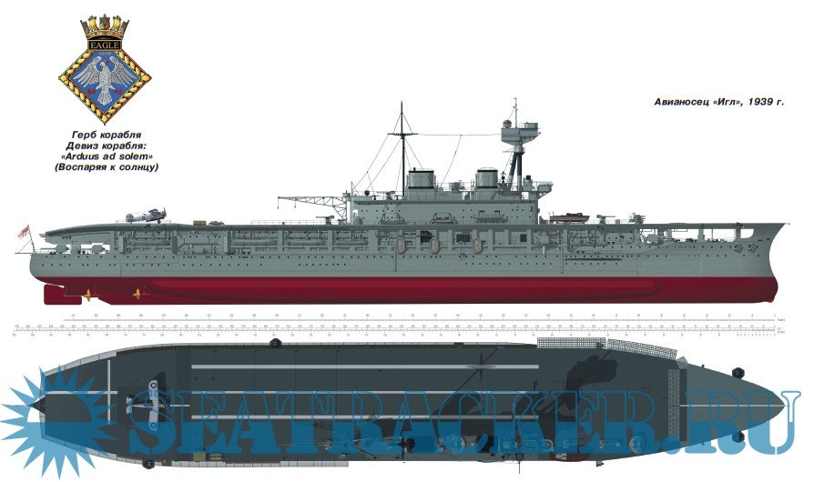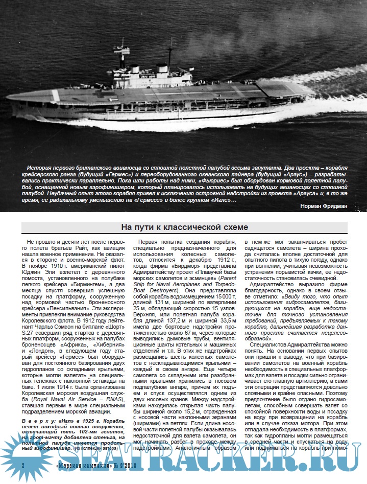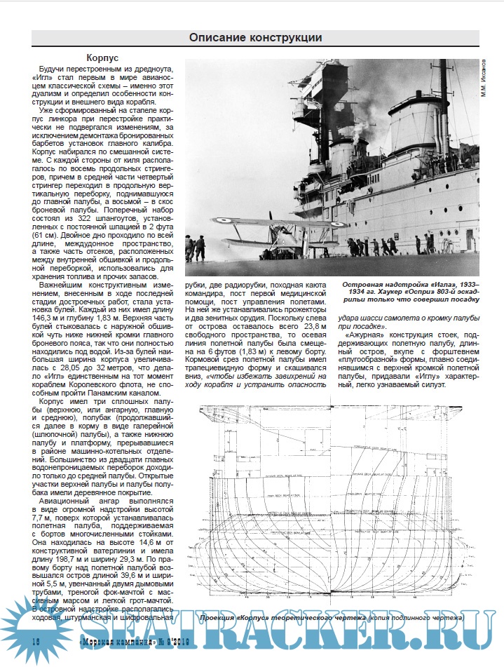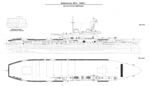Адмиралтейством и перестроен в авианосец, став первым кораблем данного класса, созданным по схеме, признанной классической – со сплошной полетной палубой и островной надстройкой, сдвинутой к правому борту. Многие из примененных на нем технических решений, пусть и не всегда выполненных оптимальным образом, были повторены на последующих кораблях, и не только британских.