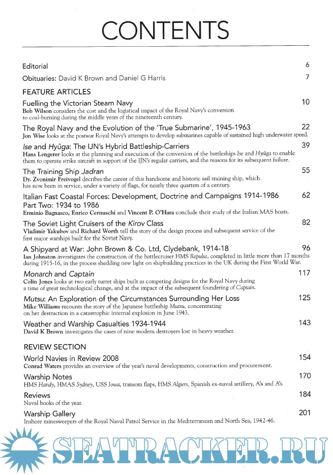 Year: 2009 Language: english Author: Warship 2008 Genre: History Publisher: Conway Maritime Press Format: PDF Quality: eBook Pages count: 210 Description: This annual collection (originally a quarterly, first published in 1977) compiles articles on ships from the world's navies as well as reviews of books and other writings on the topic. This volume comprises 10 feature articles, whose topics include: the training ship Jadran, Italian fast coastal forces from 1934-1986, the Soviet light cruisers of the Kirov class, and weather and warship casualties from 1934-1944. Four reviews are also included.