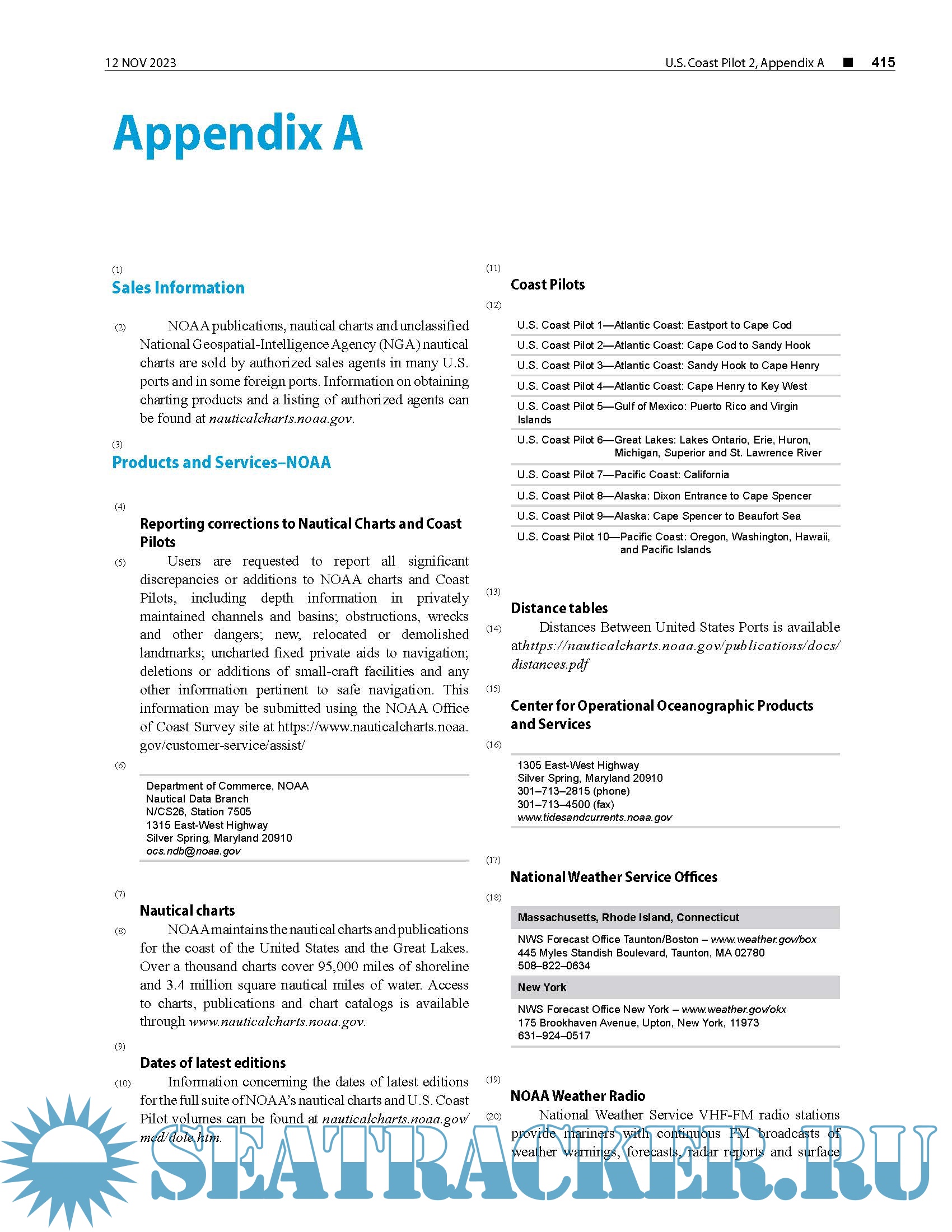 Year: 2024 Language: english Author: NOAA Genre: Documentation Edition: 2024 (53rd) Edition Format: PDF Quality: eBook Pages count: 447 Description: The United States Coast Pilot® consists of a series of nautical books that cover a variety of information important to navigators of coastal and intracoastal waters and the Great Lakes. Issued in ten volumes, they contain supplemental information that is difficult to portray on a nautical chart. Topics in the Coast Pilot include channel descriptions, anchorages, bridge and cable clearances, currents, tide and water levels, prominent features, pilotage, towage, weather, ice conditions, wharf descriptions, dangers, routes, traffic separation schemes, small-craft facilities, and Federal regulations applicable to navigation. This edition cancels the 52nd Edition and includes all previously published corrections. Updated upto 12-Nov-2023