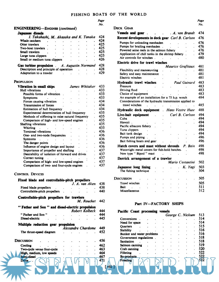 Year: 1975 Language: english Author: Jan Olof Traung Genre: Technical book Publisher: Fishing News Books Limited Format: PDF Quality: Scanned pages Pages count: 607 Description: This is the first of three volumes, covering types of boats for various fishing methods, combined fishing and research vessels, marine architecture with regard to hull shape and safety at sea, engines, propulsion systems, control devices and deck equipment, factory vessels. The books are based on the International Fishing Boat Congress of the Food and Agriculture Organization in Paris and Miami.