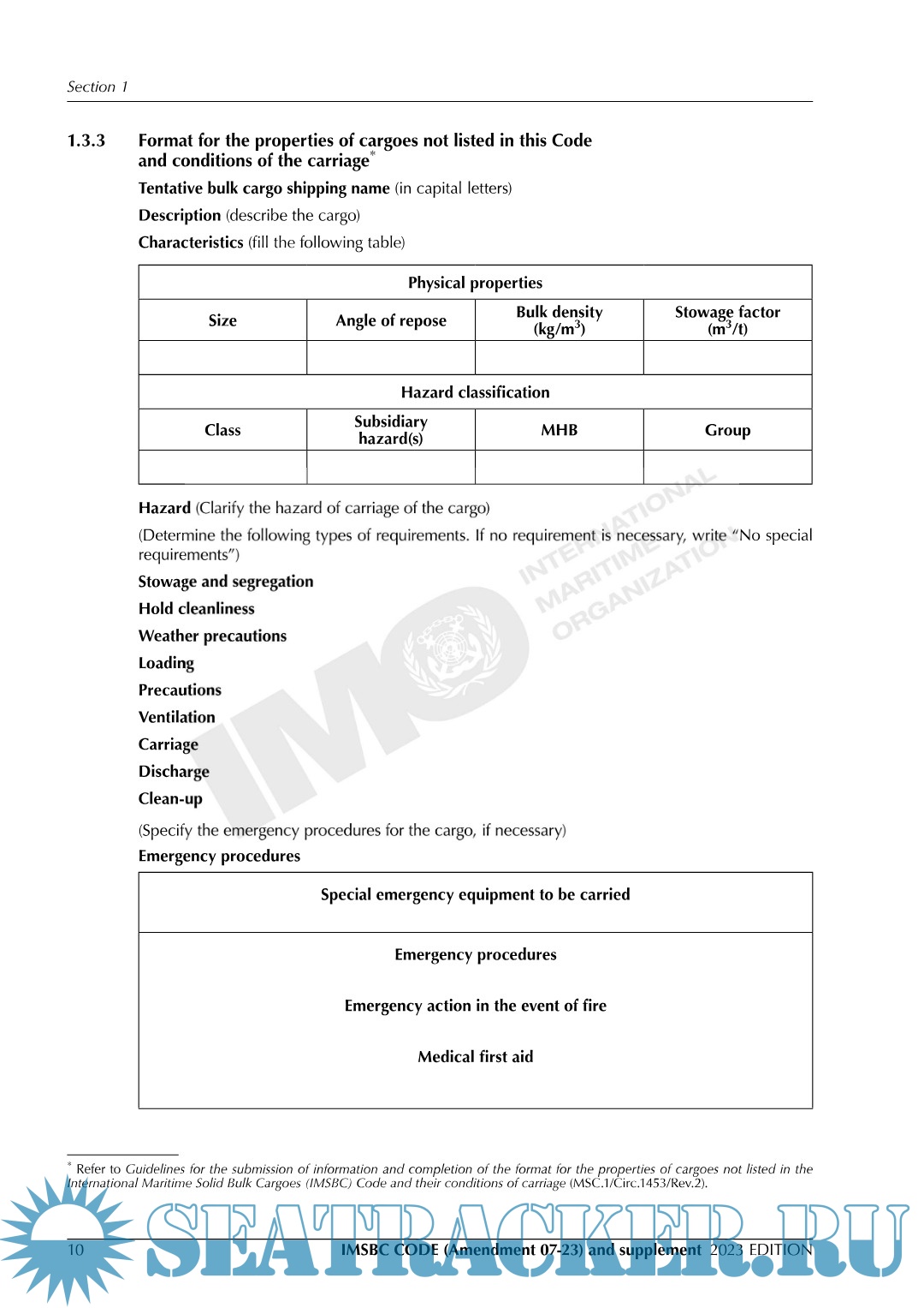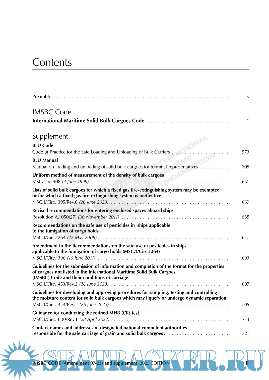 Description: The primary aim of the International Maritime Solid Bulk Cargoes Code (IMSBC Code), which replaces the Code of Safe Practice for Solid Bulk Cargoes (BC Code), is to facilitate the safe stowage and shipment of solid bulk cargoes by providing information on the dangers associated with the shipment of certain types of solid bulk cargoes and instructions on the procedures to be adopted when the shipment of solid bulk cargoes is contemplated. The IMSBC Code, adopted on 4 December 2008 by resolution MSC.268(85), entered into force on 1 January 2011, from which date it was made mandatory under the provisions of the SOLAS Convention. The Code has been amended by resolutions adopted by the Maritime Safety Committee, the most recent being resolution MSC.539(107), incorporating Amendment 07-23, which may be applied from 1 January 2024 on a voluntary basis, and has an official entry into force on 1 January 2025.