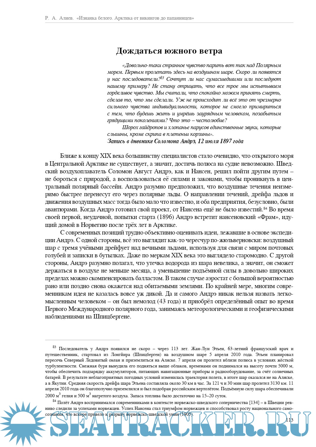 Год выпуска: 2016 Язык: русский Автор: Алиев Р. А. Формат: PDF Качество: Изначально компьютерное (eBook) Количество страниц: 351 Описание: Что влечёт людей в Арктику? Как можно стремиться туда, где царят холод и безмолвие? Отвечая на эти вопросы, автор – учёный и полярник Рамиз Алиев – рассказывает о том, чем была Арктика для человечества в разные эпохи. Для многих она стала местом подвигов во имя науки, кто-то ставил «спортивные» рекорды, соревнуясь за право первым достичь полюса или проложить новый путь. Некоторые, помимо своего на то желания, стали участниками политических и идеологических спектаклей. Многие же и вовсе попали за Полярный круг по чужой воле, в качестве заключённых. Обладая обширными знаниями в данной теме, автор рисует перед читателем объёмную картину освоения Арктики, не боясь представить собственный, иногда парадоксальный взгляд на историю и место личности в этой истории. Впервые на книжный рынок выходит работа, настолько серьёзно и глубоко анализирующая взаимоотношения Арктики и человека, причём делающая это в популярной и захватывающей форме.