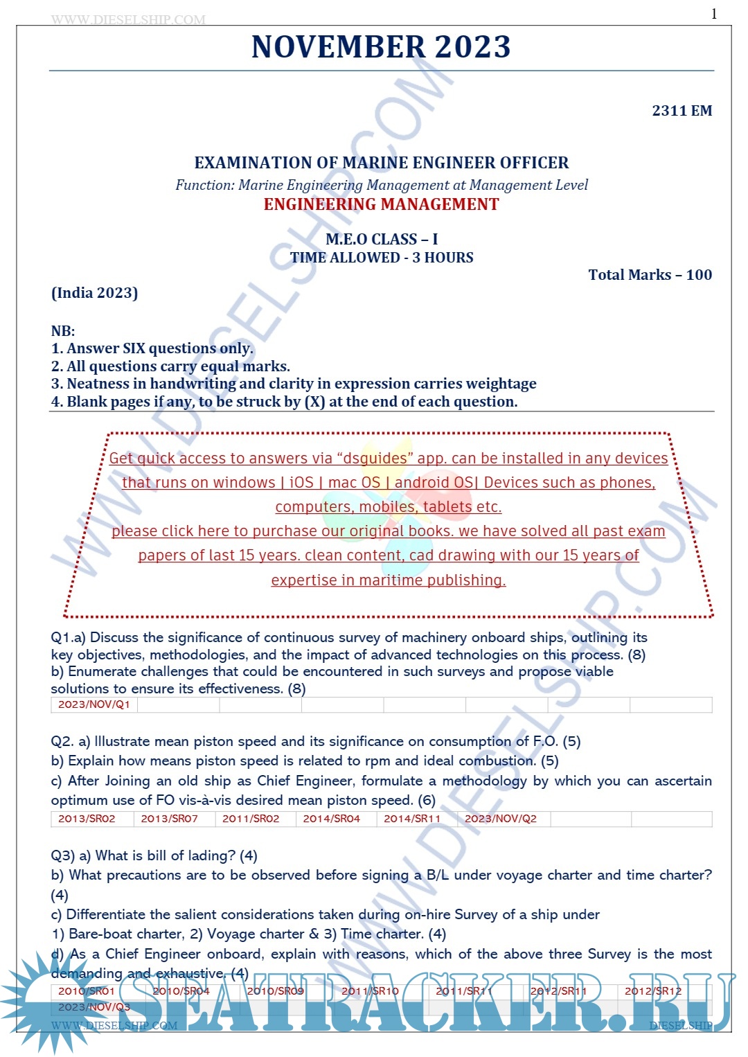 Question Paper Set for Marine Engineering Officer (M.E.O.) Class I (November 2023) MMD Examinations, India