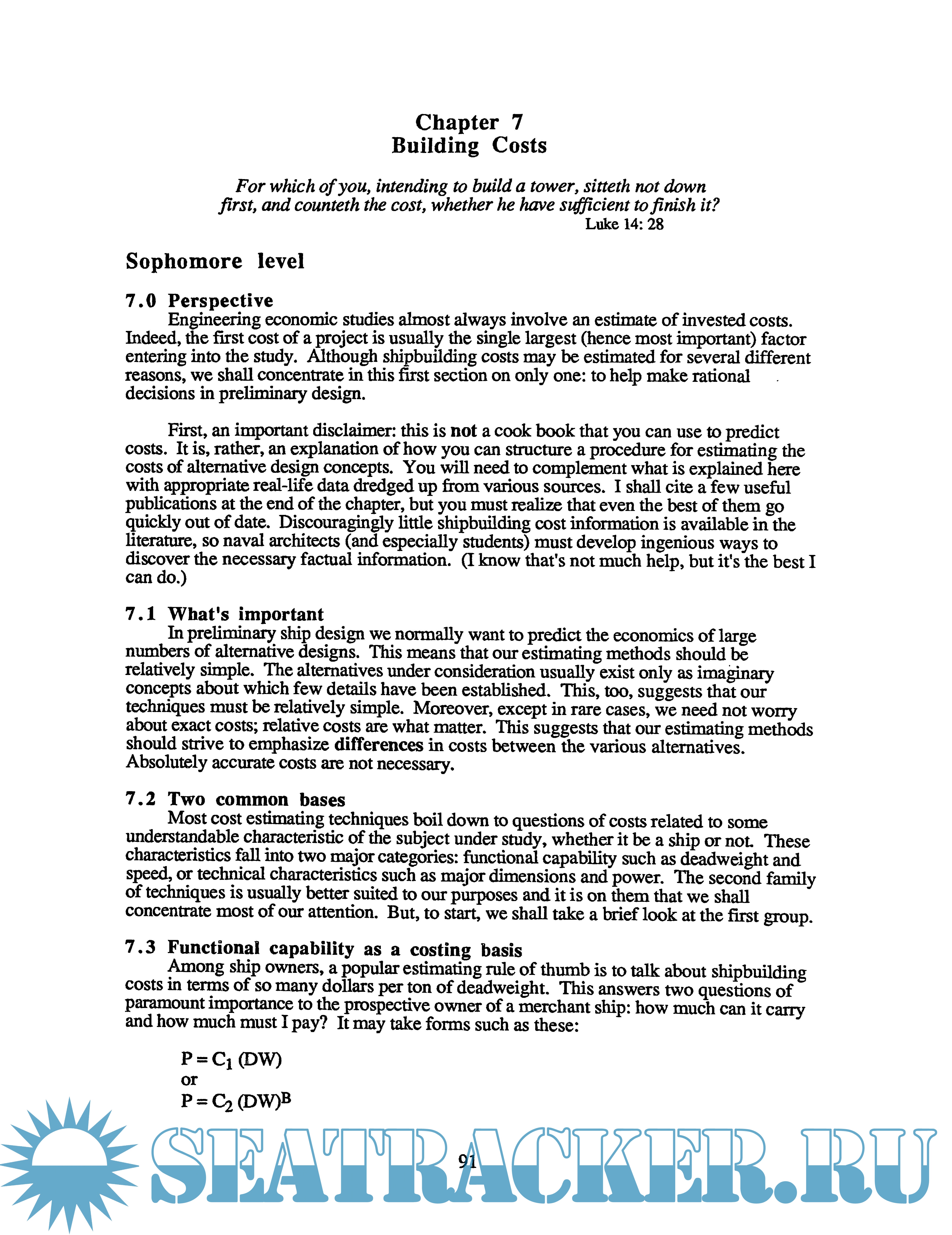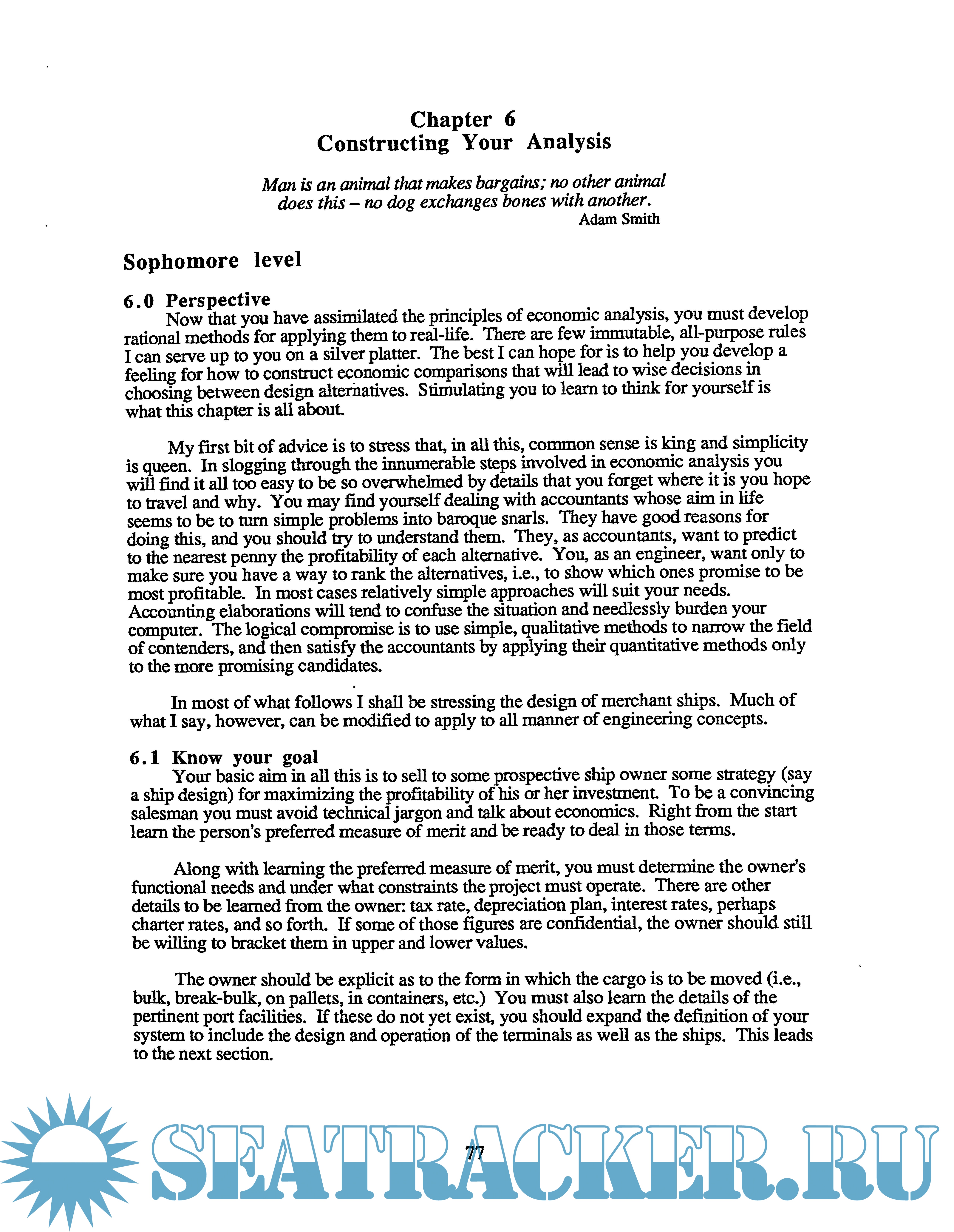 Year: 1991 Language: english Author: Harry Benford Genre: Textbook Format: PDF Quality: eBook Pages count: 134 Description: My purpose in writing this little book is to enable students of naval architecture to unravel the mysteries of ship design economics with little or no help from the academic staff. I was asked to provide such a guide, one that could be used by our students in one course at each of three academic levels, namely sophomore, junior and senior years. Each major topic is given its own chapter, and each chapter is accordingly divided into beginning, intermediate, and advanced sections. I recognize that there may be naval architects outside our own walls who want to educate themselves in this subject. They, too, will find this book suited to their needs. Whereas my intent is that our own students go through the book progressively at each of the three levels, others may choose to master each chapter in its entirety before moving on to the next. You will find that learning each topic is made easy by the inclusion of numerical examples. In addition, since true mastery requires that you do exercises, you will find plenty of mental calisthentics on which you can strengthen your mind. I urge you to spend time on the examples and also on the answers that I propose. A goodly proportion of the knowledge I wish to share with you comes out in those answers.