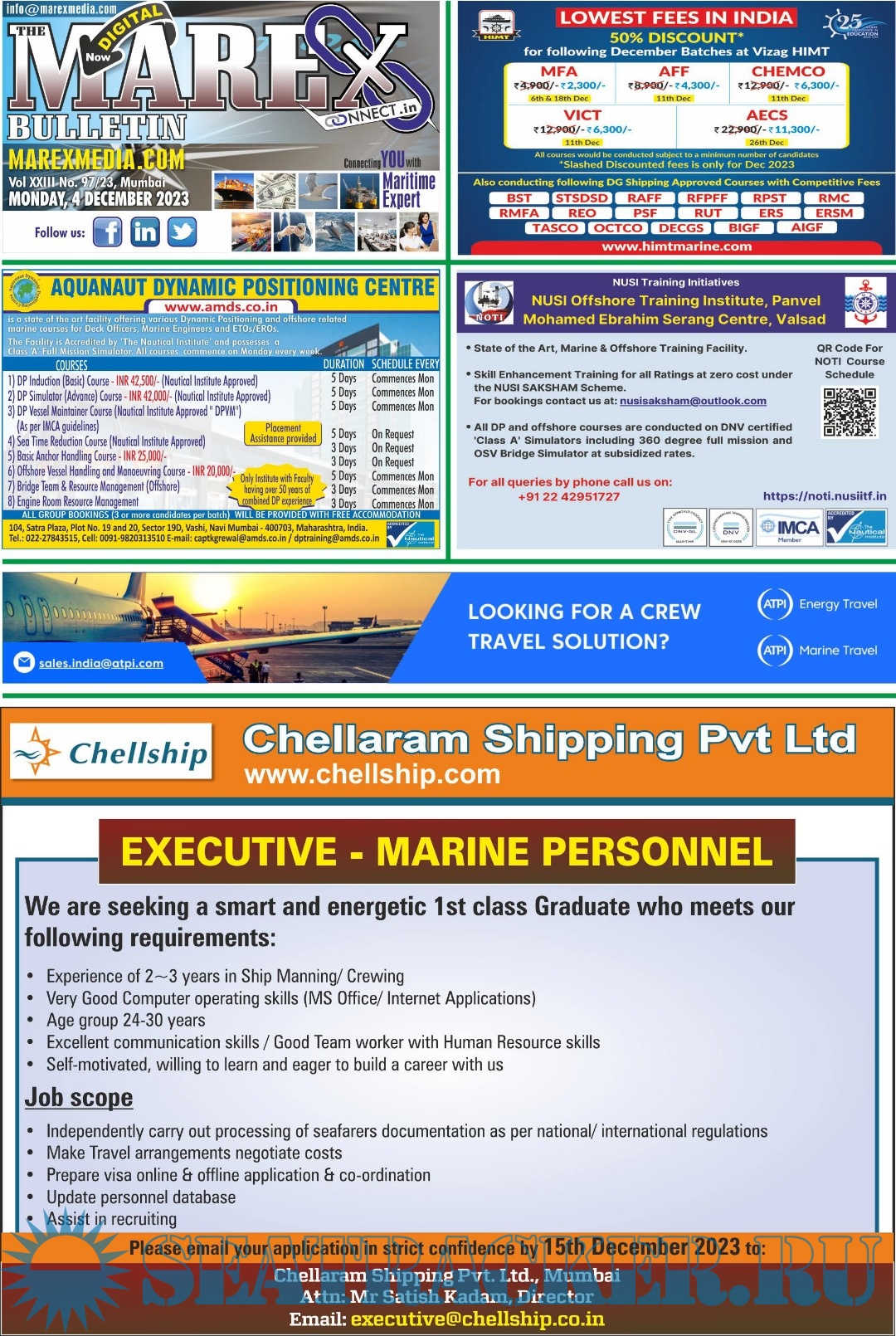 Year: 2023 Language: english Author: Marex Media Genre: Periodical (magazine) Edition: Vol.XXIII | No. 97/23 Format: PDF Quality: eBook Pages count: 44 Description: The No 1 Twice weekly employment magazine for Seafarers. The Leading magazine for seafarers to locate Ship-board Employment opportunities, Training Institutes, Shipping companies. Online version: https://issuu.com/marexmediapvtltd Additional info: Dated: 4 December 2023.