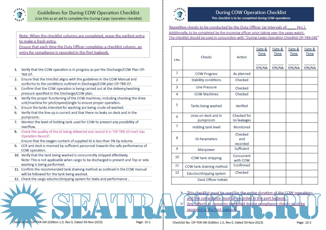 Year: 2023 Language: english Author: Synergy Marine Pte. Ltd. Genre: Handbook Edition: Edition 1.0, Rev 0, Dated 30-Nov-2023 Format: PDF Quality: eBook Pages count: 20 Description: This cargo operation checklist handbook is designed to cater safe cargo operations in line with tne company's cargo oil tanker manual alild industry stalildards. This handbook is applicable to all the Synergy managed tanlkers while carrying MARPOIL Annex I cargo. Tnis handbook does not remove the need for experience and common sense. As a cargo officer you must always assess alild relate tliie critical aspects of the operations and determine the actions whfch are deemed to be the safest.