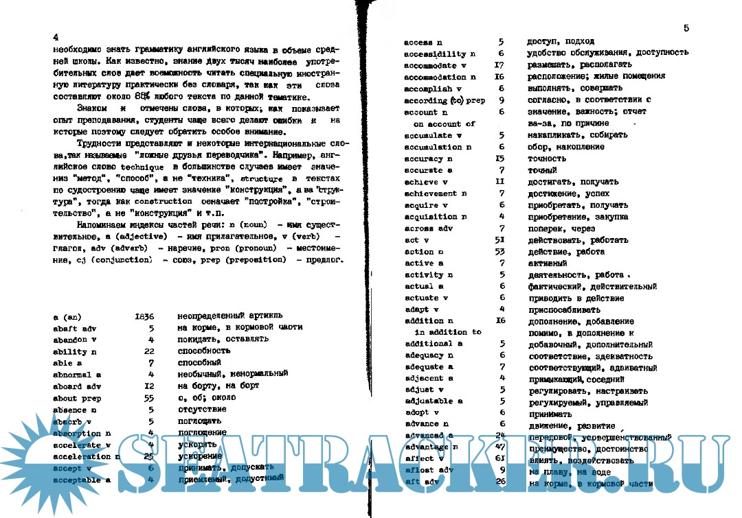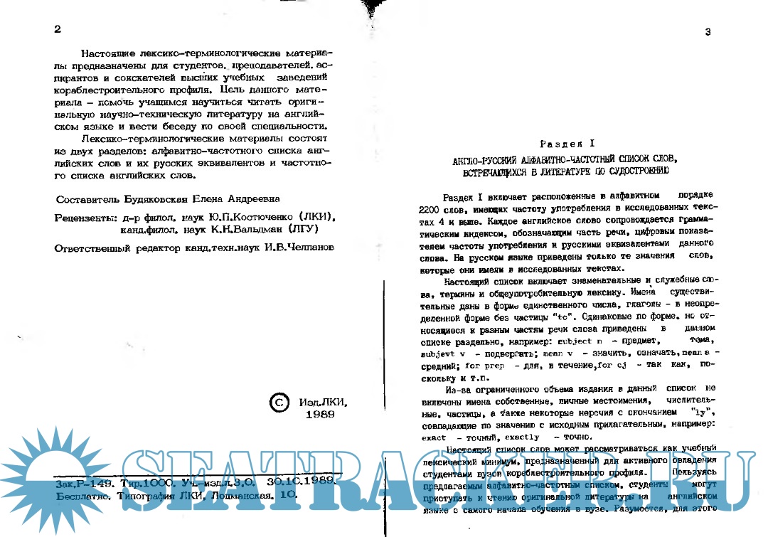 Год выпуска: 1989 Язык: английский / russian Автор: Будяковская Е. А. (сост.) Жанр: Methodological guide Издательство: ЛКИ Формат: DjVu Качество: Отсканированные страницы Количество страниц: 83 Описание: Настояние лексико-терминологические материалы предназначены для студентов, преподавателей, аспирантов и соискателей высших учебных заведений кораблестроительного профиля. Цель данного материала — помочь учащимся научиться читать оригинальную научно-техническую литературу на английском языке и вести беседу по своей специальности. Лексико-терминологические материалы состоят из двух разделов: алфавитно-частотного списка английских слов и их русских эквивалентов и частотного списка английских слов. Из-за ограниченного объема издания в данный список не включены имена собственные» личные местоимения, числительные, частицы, а также некоторые наречия с окончанием "ly", совпадающие по значению с исходным прилагательным, например: exact - точный, exactly - ТОЧНО. Настоящий список слов может рассматриваться как учебный лексический миницум, предназначенный для активного овладения студентами вузов кораблестроительного профиля. Пользуясь предлагаемым алфавитно-частотным списком, студенты могут приступать к чтению оригинальной литературы на английском языке с самого начала обучения в вузе. Разумеется» для этого