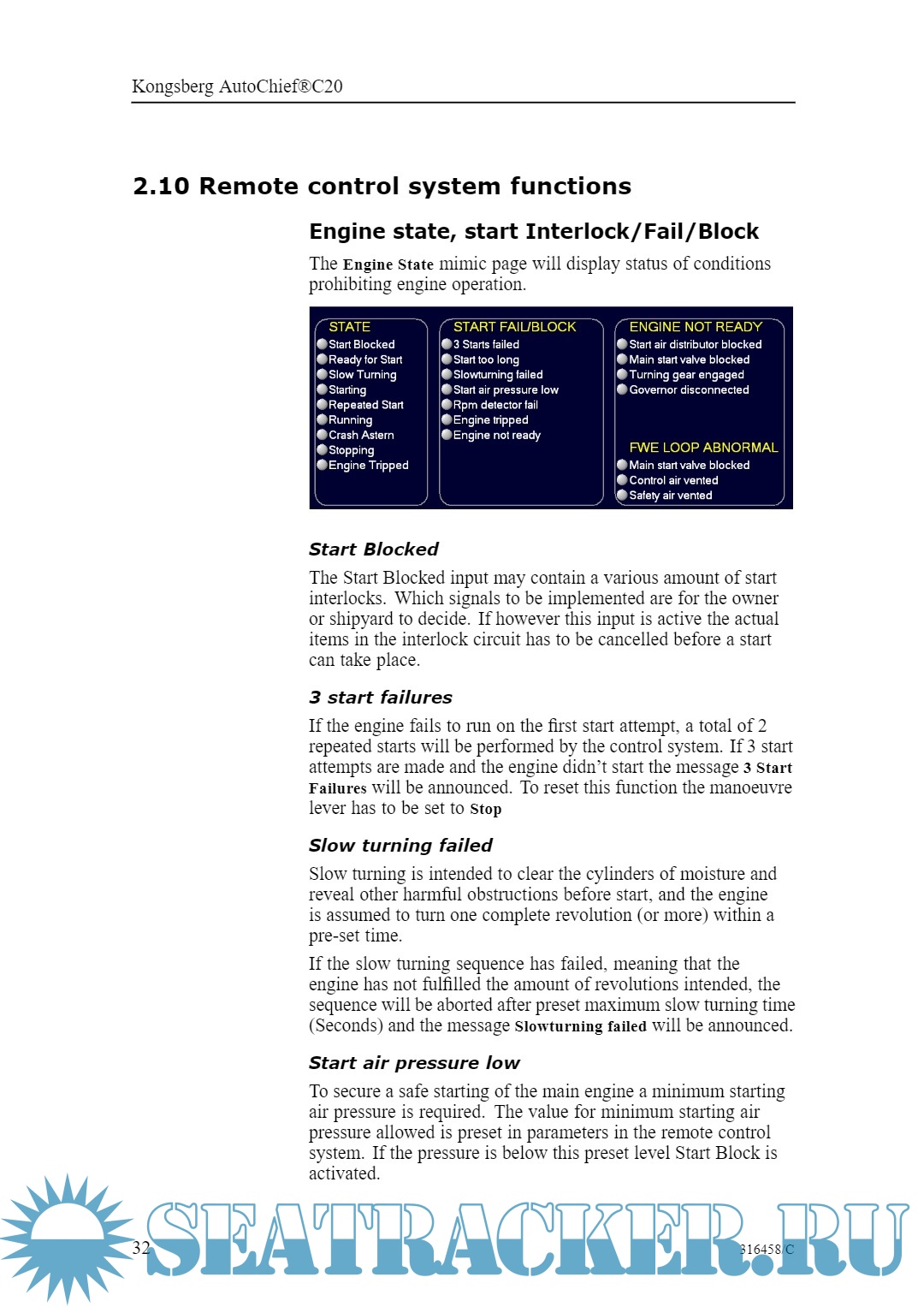 Year: 2008 Language: English Author: Konsberg Maritime A.S Genre: Manual Format: PDF Quality: eBook Pages count: 128 Description: This instruction manual for the AutoChief®C20 Propulsion Control System is intended as a guide for the ships personnel while operating the engine on a daily basis in transit between ports, assuming a standard configuration for MAN BW MC Engines with Fixed Pitch Propeller.