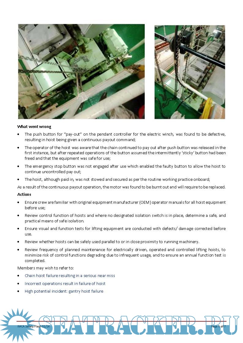 • Chain hoist paid out unsupervised near running main engine
