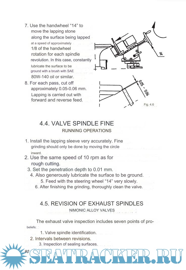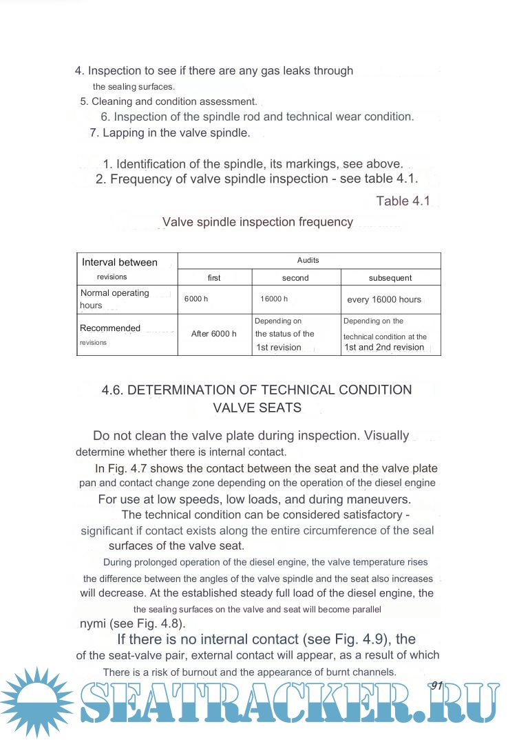 The designs of exhaust valves of such such engines as B&W, MAN B&W, Sulzer RTA, their operating and control conditions, inspection and repair are described.