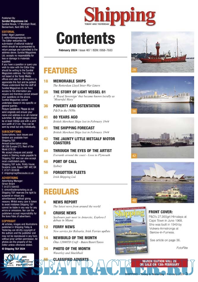 Description: Shipping T&Y is a monthly magazine for the shipping enthusiast offering up-to-date information, topical and in-depth historical articles alongside images, many of which are exclusive to the magazine.Shipping Today & Yesterday is a specialist magazine for the shipping enthusiast offering up-to-date information, topical and in-depth historical articles.Shipping Today & Yesterday was first produced in March 1990 by, the then Editor and Publisher, John Young. The first edition stated that it would, “offer a news service covering important developments in the Shipping industry Today and will look back at ships and events of Yesterday, with regular features on merchant ships