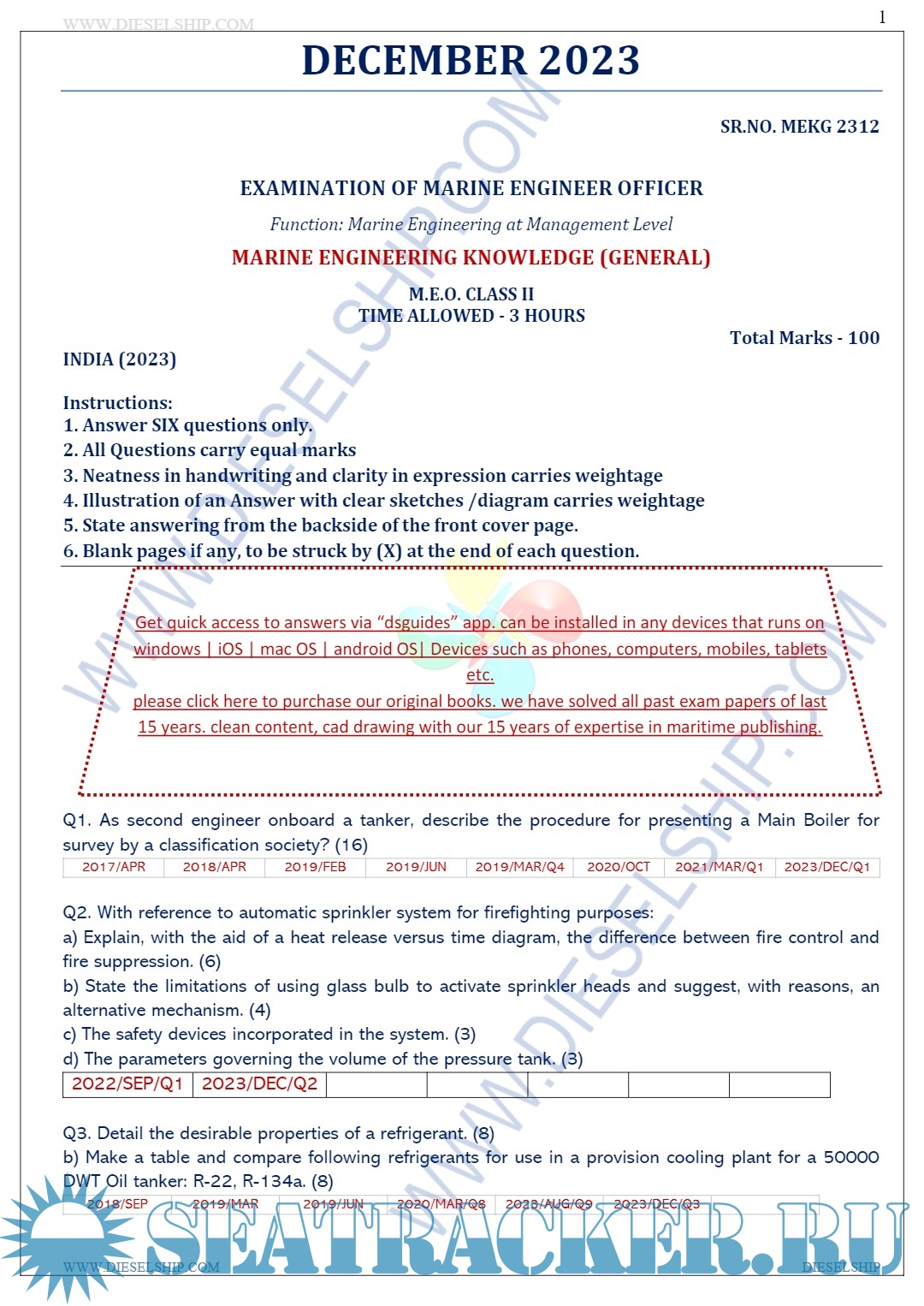 Question Paper Set for Marine Engineering Officer (M.E.O.) Class II (December 2023) MMD Examinations, India