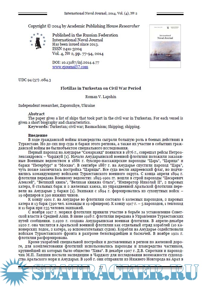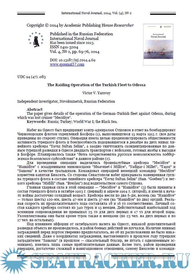 Описание: Миссия журнала заключается в создании международной дискуссионной платформы в области военно-морской истории. В отличие от большинства авторитетных военно-морских исторических журналов, мы позиционируем себя в первую очередь как один из немногих научных журналов в этой области, что предполагает необходимые требования к структурированию работы, ее метаданным, библиографическому описанию, а также процедуре рецензирования.Журнал публикует материалы, статьи и краткие сообщения о результатах исследований в области военно-морской истории, на английском и русском языках. Выходные данные статьи на английском языке.