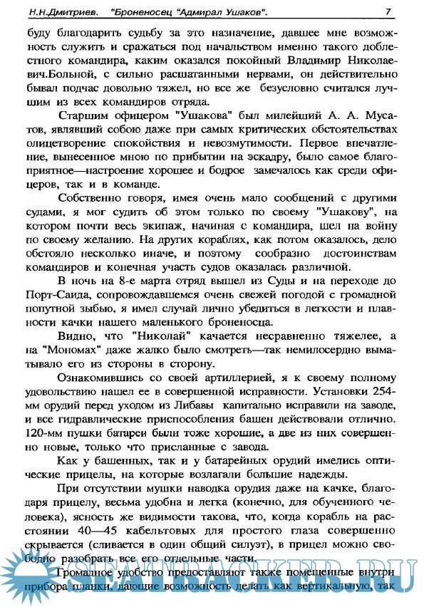 Год выпуска: 1997 Язык: русский Автор: Дмитриев Н.Н. Жанр: История Издание: Серия: Корабли и сражения Формат: PDF Качество: Отсканированные страницы Количество страниц: 76 Описание: Судьба автора этих воспоминаний Николая Николаевича Дмитриева (1876- 1931гг.) сложилась довольно удачно, если это слово применимо к его поколению, которое прошло войны и революции, потрясшие Российскую империю в начале века. Окончив в 1895 г. Морской кадетский корпус, Н.Н.Дмитриев получил звание мичмана. Спустя два года он проходит учебу в Морской стрелковой команде, а в 1903 г. оканчивает Артиллерийские классы. В период с 1902 по 1904 гг. Николай Николаевич служит на канонерских лодках Черноморского флота, которые несли стационерную службу в портах Греции. Оставить эту весьма спокойную службу, насыщенную приемами и зваными обедами с именитыми царскими особами, его заставило чувство долга, и он добровольно идет служить на 3-ю тихоокеанскую эскадру, уходящую на войну к далеким берегам. В должности старшего артиллерийского офицера на броненосце береговой обороны “Адмирал Ушаков” Н.Н.Дмитриев провел долгие месяцы опасного океанского плавания и стал свидетелем полного разгрома эскадры З.П.Рожественского в дневном бою 14 мая, последовавших затем ночных атак японских миноносцев и героического боя “Адмирале Ушакове” с двумя японскими броненосными крейсерами, значительно превосходившими его по своей боевой мощи. Прочитав эти воспоминания, читатель узнает о малоизвестных фактах похода эскадры контр-адмирала Н.И.Небогатова. Следует отметить, что Н.Н..Дмитриев является все же человеком своего времени. Описывая вереницу происходящих на эскадре событий, он почти не уделяет внимания тому, как проводилась артиллерийская подготовка на его корабле. а ведь это была главная его обязанность, так как в предстоящем сражении нанести значительный урон врагу можно было только в артиллерийском противоборстве двух эскадр. Поддержание боевой готовности артиллерийского оружия требует огромного напряжения сил у личного состава и проведения большого числа стрельб, коими в русском флоте так преступно пренебрегали даже на кораблях, идущих в бой. Но основная причине поражения осталась у главного артиллериста “Адмирала Ушакова” без детального рассмотрения.