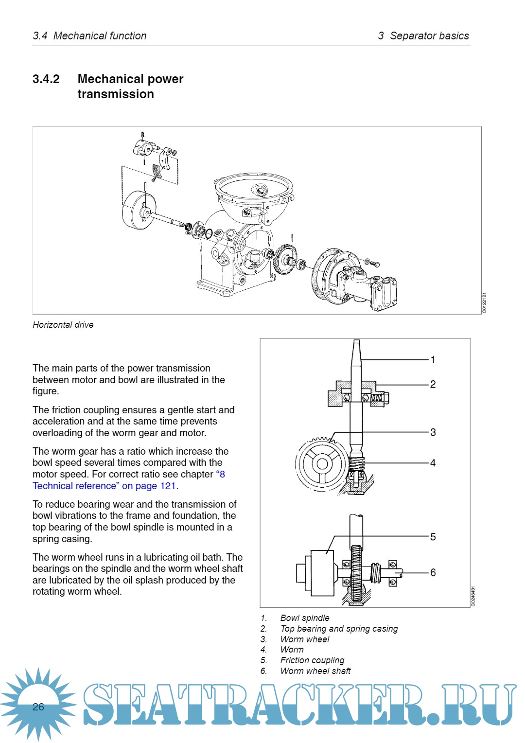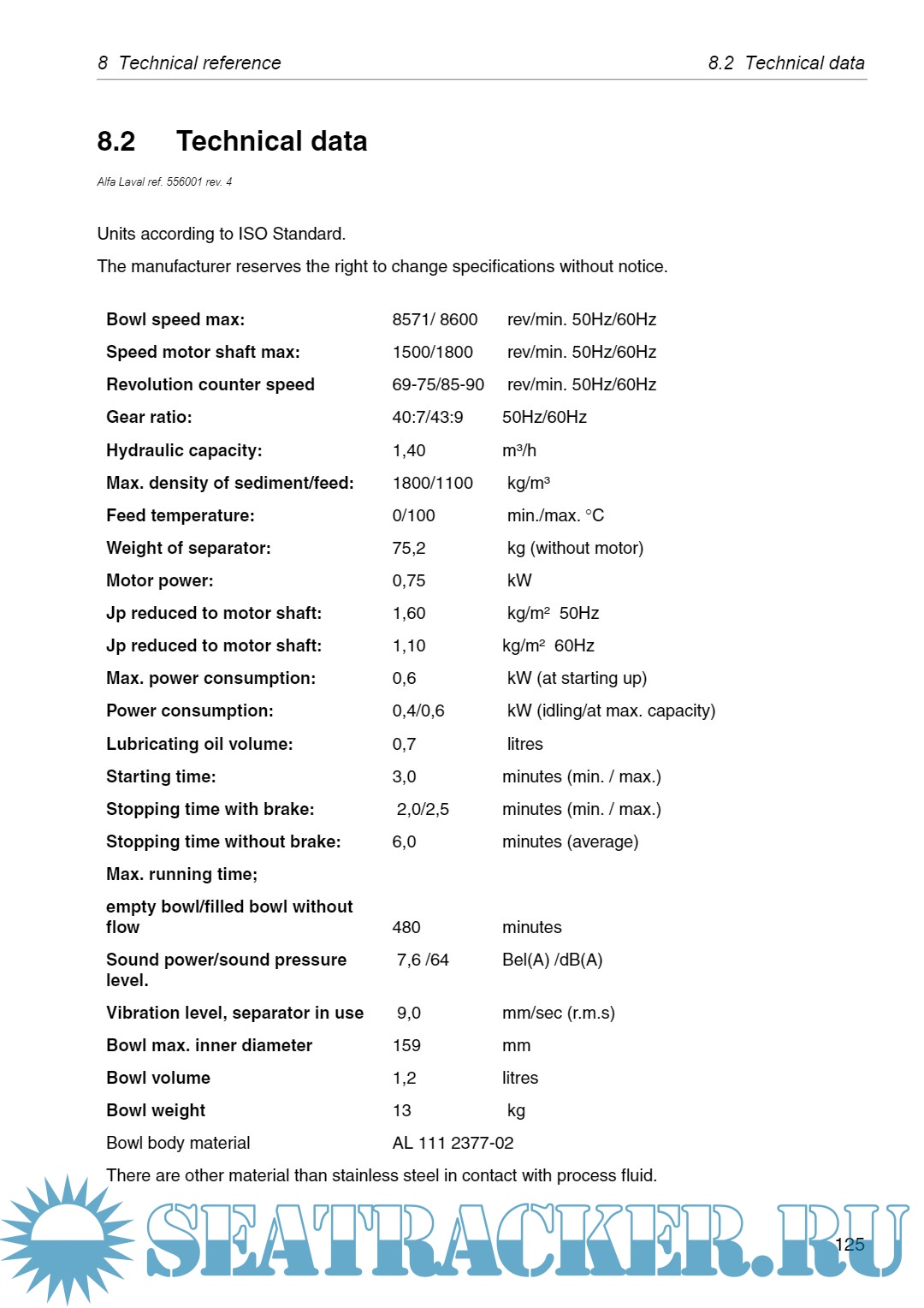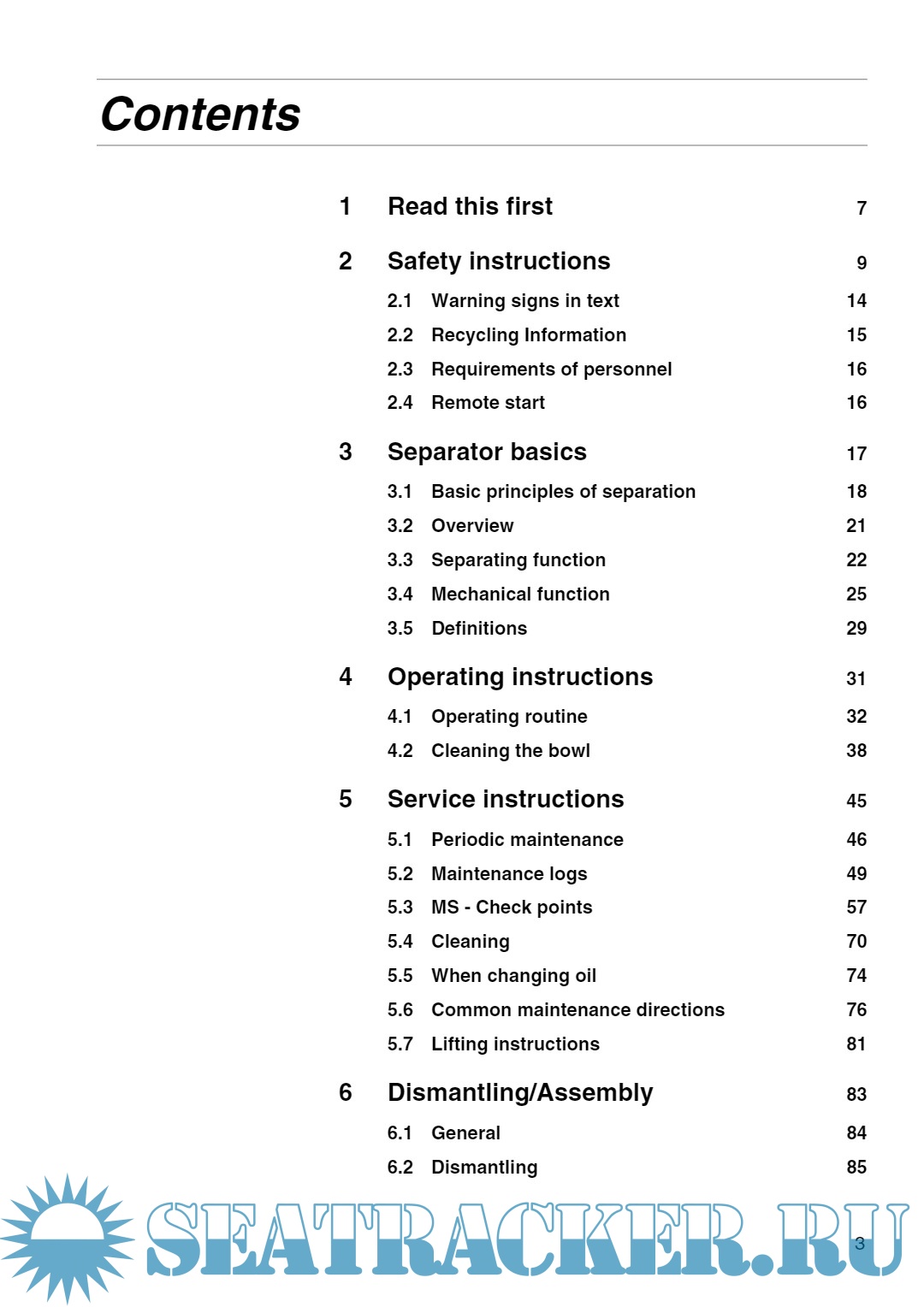 Year: 2019 Language: English Author: Alfa Laval Tumba AB Genre: Manual Publisher: Alfa Laval Tumba AB Format: PDF Quality: eBook Pages count: 164 Description: This manual is designed for operators and service engineers working with the Alfa Laval separator MAB 103B-24. For information concerning the function of the separator, see ‘‘3 Separator basics” on page 17, and ‘‘4 Operating instructions” on page 31. If the separator has been delivered and installed by Alfa Laval as part of a processing system, this manual is a part of the System Manual. In this case, study carefully all the instructions in the System Manual. In addition to this Separator manual a Spare Parts Catalogue, SPC is supplied. This Separator manual consists of: Safety instructions Pay special attention to the safety instructions for the separator. Not following the safety instructions can cause accidents resulting in damage to equipment and serious injury to personnel. Separator basics Read this chapter if you are not familiar with this type of separator. Operating instructions This chapter contains operating instructions for the separator only.