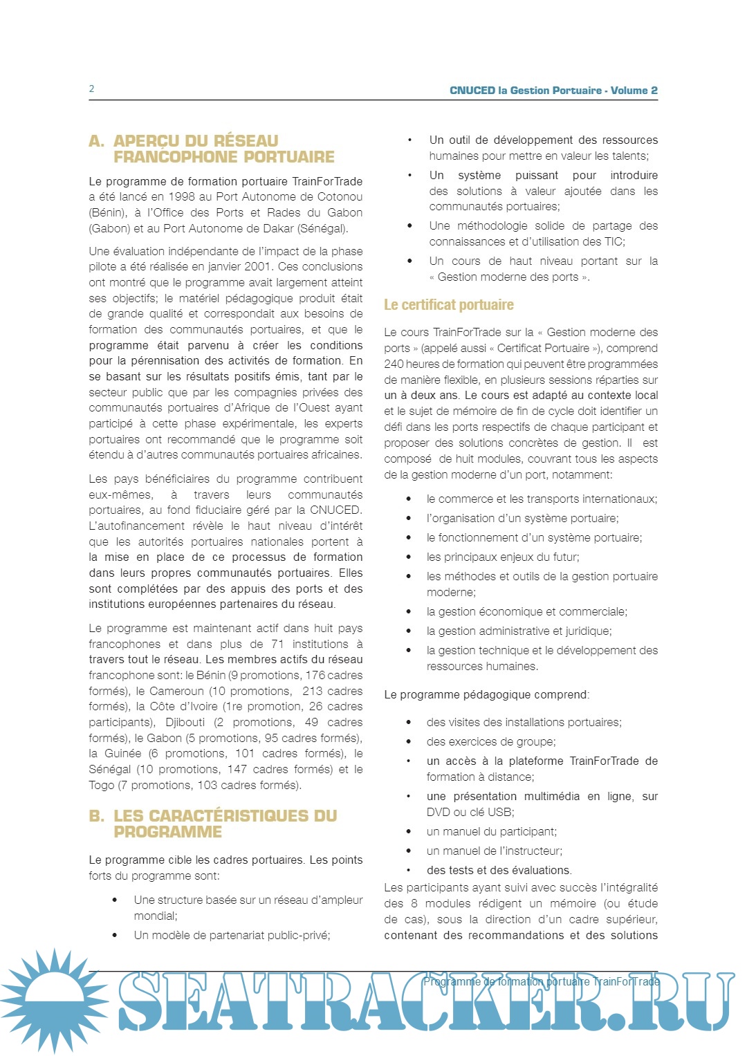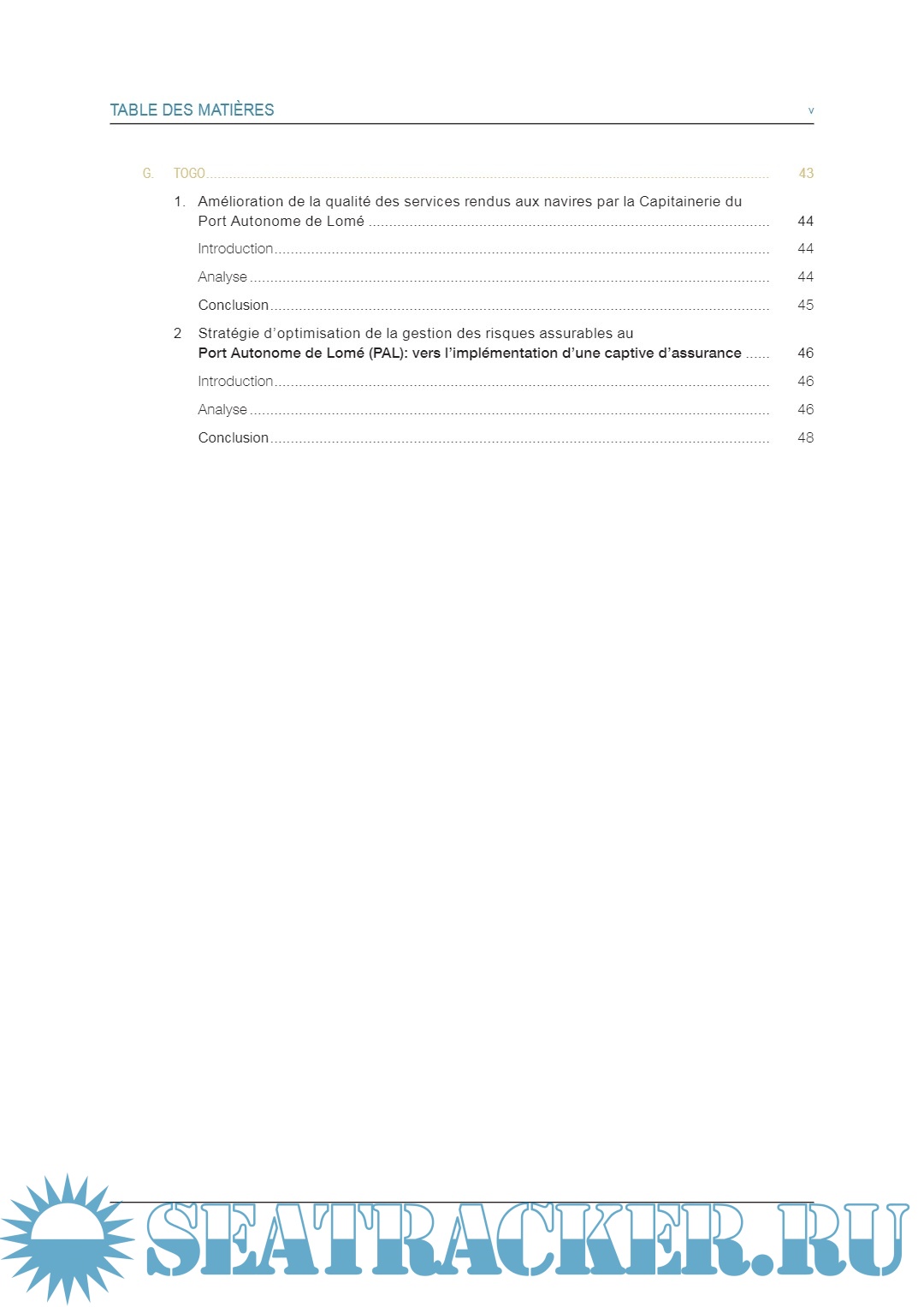 Description: Cette publication a été produite dans le cadre des activités du programme de formation portuaire TrainForTrade de la CNUCED. Elle a été financée par les ports du Bénin, Cameroun, Djibouti, Gabon, Guinée, Sénégal et Togo. Ce projet a aussi reçu le soutien des grands ports maritimes de Nantes Saint-Nazaire et de Marseille (France). Les résumés des études de cas soumises par les participants de la formation composant cette publication ont été préparés par Elodie Bardin et Carine Fabre de l’institut de formation du Port de Marseille-Fos, Alvaro Moreira et Anne Hocevar, consultants pour la CNUCED, Dominique Chantrel et Stéphanie Garcia, membres du personnel de la CNUCED, le tout encadré par Mark Assaf, Chef de la Section du développement des ressources humaines/ TrainForTrade, sous la supervision de Geneviève Féraud, Chef du Service du développement des connaissances. Dans la présente publication, les termes pays/économie désignent, selon le cas, des territoires ou des zones. Les appellations employées et la présentation des données n’impliquent de la part du Secrétariat de l’Organisation des Nations Unies aucune prise de position quant au statut juridique des pays, territoires, villes ou zones ou de leurs autorités, ni quant au tracé de leurs frontières ou limites. La mention d’une société et de ses activités ne doit pas être interprétée comme une marque de soutien de la part de la CNUCED à cette société ou à ses activités. Le texte de la présente publication peut être cité ou reproduit, sous réserve qu’il soit fait mention de la source et qu’un exemplaire de la publication où sera reproduit l’extrait cité soit communiqué au secrétariat de la CNUCED. Le présent document n’a pas fait l’objet d’une relecture par les services d’édition.
