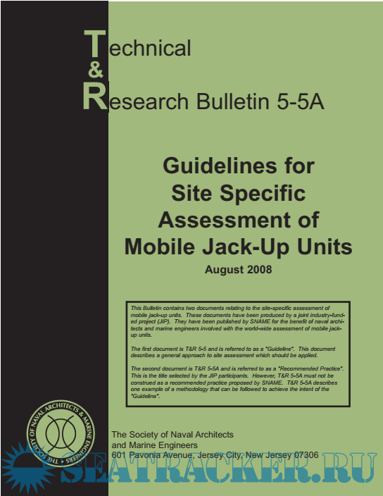 Description: This Bulletin contains two documents relating to the site-specific assessment of mobile jack-up units. These documents have been produced by a joint industry-funded project (JIP). They have been published by SNAME for the benefit of naval architects and marine engineers involved with the world-wide assessment of mobile jackup units.